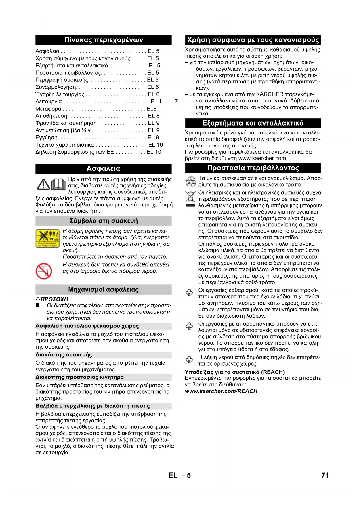 Χρησιμοποιείτε μόνο γνήσια παρελκόμενα και ανταλλα- κτικά τα οποία διασφαλίζουν την ασφαλή και απρόσκο- πτη λειτουργία της συσκευής. Πληροφορίες για παρελκόμενα και ανταλλακτικά θα βρείτε στη διεύθυνση www.kaercher.com. Υποδείξεις για τα συστατικά (REACH) Ενημερωμένες πληροφορίες για τα συστατικά μπορείτε να βρείτε στη διεύθυνση: www.kaercher.com/REACH Πίνακας περιεχομένων Ασφάλεια . . . . . . . . . . . . . . . . . . . . . . . . . . . . EL 5 Χρήση σύμφωνα με τους κανονισμούς . . . . . EL 5 Εξαρτήματα και ανταλλακτικά . . . . . . . . . . . . EL 5 Προστασία περιβάλλοντος. . . . . . . . . . . . . . . EL 5 Περιγραφή συσκευής. . . . . . . . . . . . . . . . . . . EL 6 Συναρμολόγηση. . . . . . . . . . . . . . . . . . . . . . . EL 6 Έναρξη λειτουργίας . . . . . . . . . . . . . . . . . . . . EL 6 Λειτουργία . . . . . . . . . . . . . . . . . . . . . . . . . . .EL 7 Μεταφορά . . . . . . . . . . . . . . . . . . . . . . . . . . . EL8 Αποθήκευση . . . . . . . . . . . . . . . . . . . . . . . . . EL 8 Φροντίδα και συντήρηση . . . . . . . . . . . . . . . . EL 9 Αντιμετώπιση βλαβών . . . . . . . . . . . . . . . . . . EL 9 Εγγύηση . . . . . . . . . . . . . . . . . . . . . . . . . . . . EL 9 Τεχνικά χαρακτηριστικά . . . . . . . . . . . . . . . . . EL 10 Δήλωση Συμμόρφωσης των ΕE . . . . . . . . . . EL 10