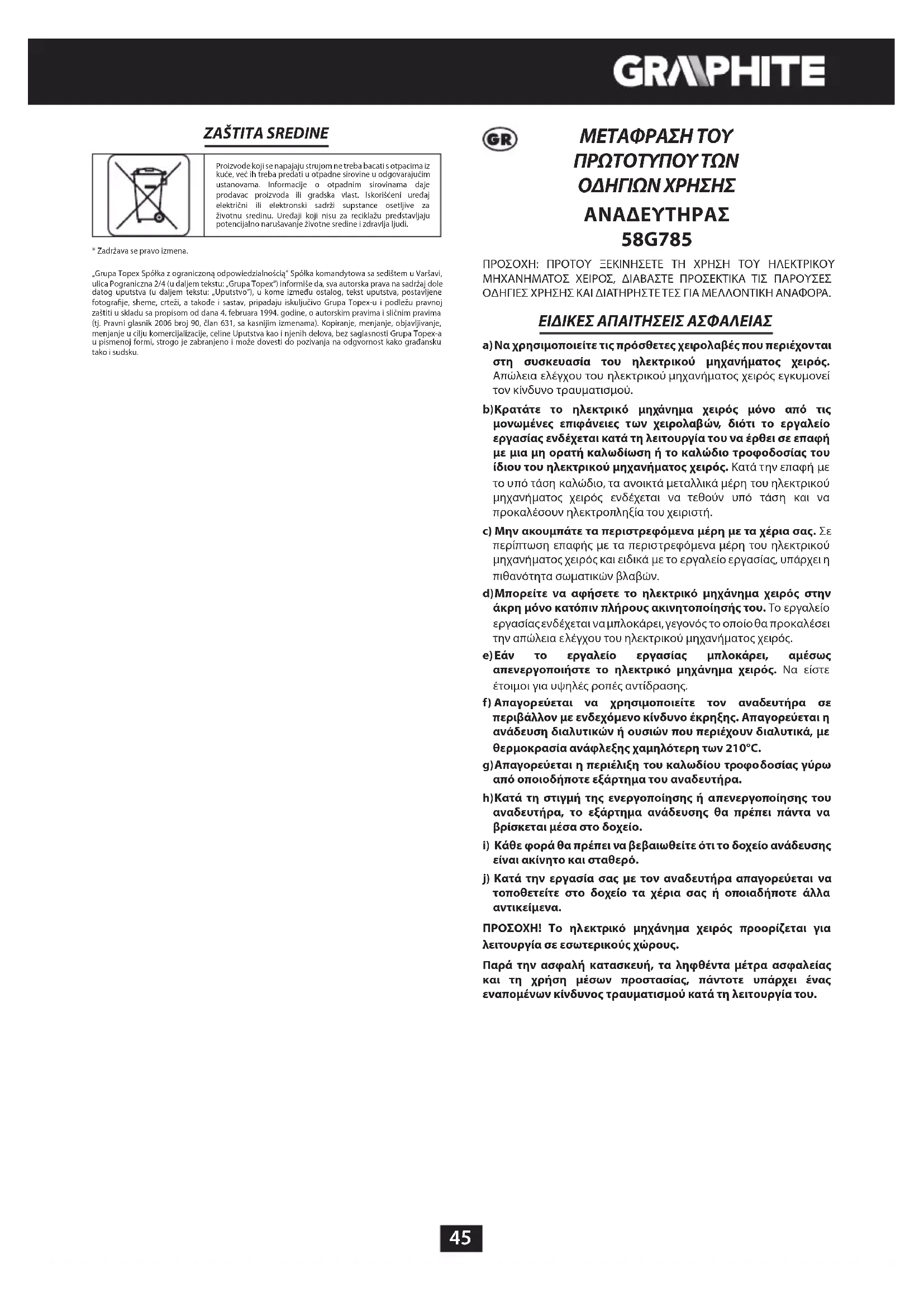 - Zadržava se pravo izmena. „Grupa Topex Spółka z ograniczoną odpowiedzialnością“ Spółka komandytowa sa sedištem u Varšavi, ulica Pograniczna 2/4 (u daljem tekstu: „Grupa Topex“) informiše da, sva autorska prava na sadržaj dole datog uputstva (u daljem tekstu: „Uputstvo“), u kome između ostalog, tekst uputstva, postavljene fotografije, sheme, crteži, a takođe i sastav, pripadaju iskuljučivo Grupa Topex-u i podležu pravnoj zaštiti u skladu sa propisom od dana 4. februara 1994. godine, o autorskim pravima i sličnim pravima (tj. Pravni glasnik 2006 broj 90, član 631, sa kasnijim izmenama). Kopiranje, menjanje, objavljivanje, menjanje u cilju komercijalizacije, celine Uputstva kao i njenih delova, bez saglasnosti Grupa Topex-a u pismenoj formi, strogo je zabranjeno i može dovesti do pozivanja na odgvornost kako građansku tako i sudsku. ΜΕΤΑΦΡΑΣΗ ΤΟΥ ΠΡΩΤΟΤΥΠΟΥ ΤΩΝ ΟΔΗΓΙΩΝ ΧΡΗΣΗΣ ΑΝΑΔΕΥΤΗΡΑΣ 58G785 ΠΡΟΣΟΧΗ: ΠΡΟΤΟΥ ΞΕΚΙΝΗΣΕΤΕ ΤΗ ΧΡΗΣΗ ΤΟΥ ΗΛΕΚΤΡΙΚΟΥ ΜΗΧΑΝΗΜΑΤΟΣ ΧΕΙΡΟΣ, ΔΙΑΒΑΣΤΕ ΠΡΟΣΕΚΤΙΚΑ ΤΙΣ ΠΑΡΟΥΣΕΣ ΟΔΗΓΙΕΣ ΧΡΗΣΗΣ ΚΑΙ ΔΙΑΤΗΡΗΣΤΕ ΤΕΣ ΓΙΑ ΜΕΛΛΟΝΤΙΚΗ ΑΝΑΦΟΡΑ. ΕΙΔΙΚΕΣ ΑΠΑΙΤΗΣΕΙΣ ΑΣΦΑΛΕΙΑΣ a) Να χρησιμοποιείτε τις πρόσθετες χειρολαβές που περιέχονται στη συσκευασία του ηλεκτρικού μηχανήματος χειρός. Απώλεια ελέγχου του ηλεκτρικού μηχανήματος χειρός εγκυμονεί τον κίνδυνο τραυματισμού. b) Κρατάτε το ηλεκτρικό μηχάνημα χειρός μόνο από τις μονωμένες επιφάνειες των χειρολαβών, διότι το εργαλείο εργασίας ενδέχεται κατά τη λειτουργία του να έρθει σε επαφή με μια μη ορατή καλωδίωση ή το καλώδιο τροφοδοσίας του ίδιου του ηλεκτρικού μηχανήματος χειρός. Κατά την επαφή με το υπό τάση καλώδιο, τα ανοικτά μεταλλικά μέρη του ηλεκτρικού μηχανήματος χειρός ενδέχεται να τεθούν υπό τάση και να προκαλέσουν ηλεκτροπληξία του χειριστή. c) Μην ακουμπάτε τα περιστρεφόμενα μέρη με τα χέρια σας. Σε περίπτωση επαφής με τα περιστρεφόμενα μέρη του ηλεκτρικού μηχανήματος χειρός και ειδικά με το εργαλείο εργασίας, υπάρχει η πιθανότητα σωματικών βλαβών. d) Μπορείτε να αφήσετε το ηλεκτρικό μηχάνημα χειρός στην άκρη μόνο κατόπιν πλήρους ακινητοποίησής του. Το εργαλείο εργασίας ενδέχεται να μπλοκάρει, γεγονός το οποίο θα προκαλέσει την απώλεια ελέγχου του ηλεκτρικού μηχανήματος χειρός. e) Εάν το εργαλείο εργασίας μπλοκάρει, αμέσως απενεργοποιήστε το ηλεκτρικό μηχάνημα χειρός. Να είστε έτοιμοι για υψηλές ροπές αντίδρασης. f) Απαγορεύεται να χρησιμοποιείτε τον αναδευτήρα σε περιβάλλον με ενδεχόμενο κίνδυνο έκρηξης. Απαγορεύεται η ανάδευση διαλυτικών ή ουσιών που περιέχουν διαλυτικά, με θερμοκρασία ανάφλεξης χαμηλότερη των 210°C. g) Απαγορεύεται η περιέλιξη του καλωδίου τροφοδοσίας γύρω από οποιοδήποτε εξάρτημα του αναδευτήρα. h) Κατά τη στιγμή της ενεργοποίησης ή απενεργοποίησης του αναδευτήρα, το εξάρτημα ανάδευσης θα πρέπει πάντα να βρίσκεται μέσα στο δοχείο.