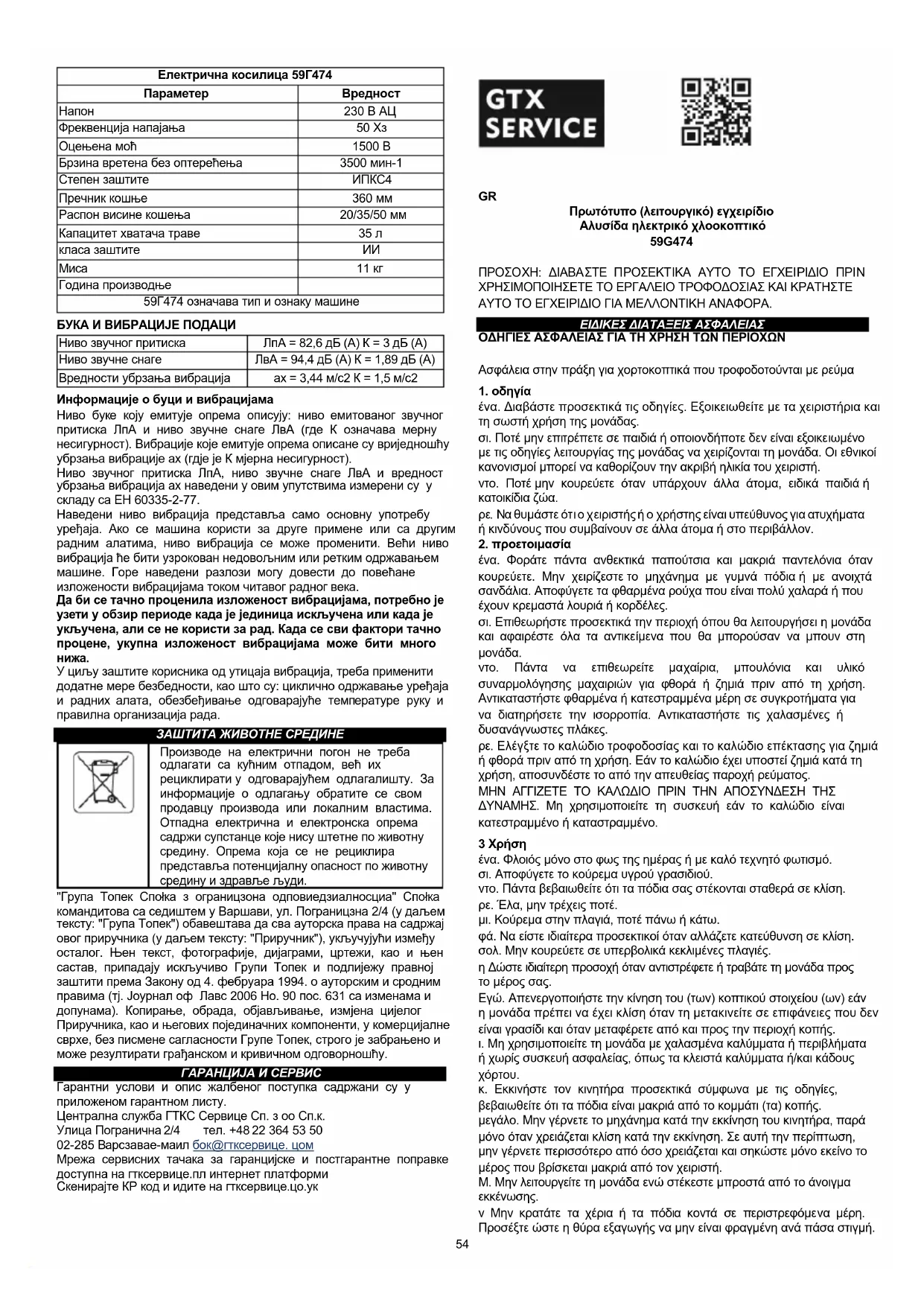 Το 59G474 υποδεικνύει τόσο τον τύπο όσο και τον χαρακτηρισμό του μηχανήματος ΘΟΡΥΒΟΣ ΚΑΙ ΔΟΝΗΣΗ ΔΕΔΟΜΕΝΑ Στάθμη ηχητικής πίεσης LpA = 82,6 dB (A) K = 3 dB (A) Επίπεδο ηχητικής ισχύος LwA = 94,4 dB (A) K = 1,89 dB (A) Τιμές επιτάχυνσης δόνησης ah = 3,44 m/s2 K = 1,5 m/s2 Πληροφορίες για θόρυβο και κραδασμούς Το επίπεδο θορύβου που εκπέμπεται από τον εξοπλισμό περιγράφεται από: το επίπεδο εκπεμπόμενης ηχητικής πίεσης LpA και το επίπεδο ηχητικής ισχύος LwA (όπου το Κ δηλώνει αβεβαιότητα μέτρησης). Οι δονήσεις που εκπέμπονται από τον εξοπλισμό περιγράφονται από την τιμή επιτάχυνσης κραδασμών ah (όπου K είναι η αβεβαιότητα μέτρησης). Το επίπεδο ηχητικής πίεσης LpA, το επίπεδο ηχητικής ισχύος LwA και η τιμή επιτάχυνσης δόνησης ah που καθορίζονται σε αυτές τις οδηγίες μετρήθηκαν σύμφωνα με το EN 60335-2-77. Το επίπεδο δόνησης που αναφέρεται είναι αντιπροσωπευτικό μόνο της βασικής χρήσης της συσκευής. Εάν το μηχάνημα χρησιμοποιείται για άλλες εφαρμογές ή με άλλα εργαλεία εργασίας, το επίπεδο δόνησης μπορεί να αλλάξει. Ένα υψηλότερο επίπεδο κραδασμών θα προκληθεί από ανεπαρκή ή σπάνια συντήρηση του μηχανήματος. Οι λόγοι που αναφέρονται παραπάνω μπορεί να οδηγήσουν σε αυξημένη έκθεση σε κραδασμούς καθ 'όλη τη διάρκεια ζωής. Προκειμένου να εκτιμηθεί με ακρίβεια η έκθεση σε κραδασμούς, είναι απαραίτητο να ληφθούν υπόψη οι περίοδοι όταν η μονάδα είναι απενεργοποιημένη ή όταν είναι ενεργοποιημένη αλλά δεν χρησιμοποιείται για εργασία. Όταν όλοι οι παράγοντες εκτιμηθούν με ακρίβεια, η συνολική έκθεση σε κραδασμούς μπορεί να είναι πολύ χαμηλότερη. Προκειμένου να προστατευθεί ο χρήστης από τις επιπτώσεις των κραδασμών, θα πρέπει να εφαρμοστούν πρόσθετα μέτρα ασφαλείας, όπως: κυκλική συντήρηση της συσκευής και εργαλείων εργασίας, εξασφάλιση της σωστής θερμοκρασίας των χεριών και σωστή οργάνωση της εργασίας. ΤΗΝ ΠΡΟΣΤΑΣΙΑ ΤΟΥ ΠΕΡΙΒΑΛΛΟΝΤΟΣ Τα προϊόντα με ηλεκτρική ενέργεια δεν πρέπει να απορρίπτονται μαζί με τα οικιακά απορρίμματα, αλλά να ανακυκλώνονται σε κατάλληλη εγκατάσταση διάθεσης. Για πληροφορίες απόρριψης, συμβουλευτείτε τον έμπορο προϊόντων ή την τοπική αρχή. Τα απόβλητα ηλεκτρικού και ηλεκτρονικού