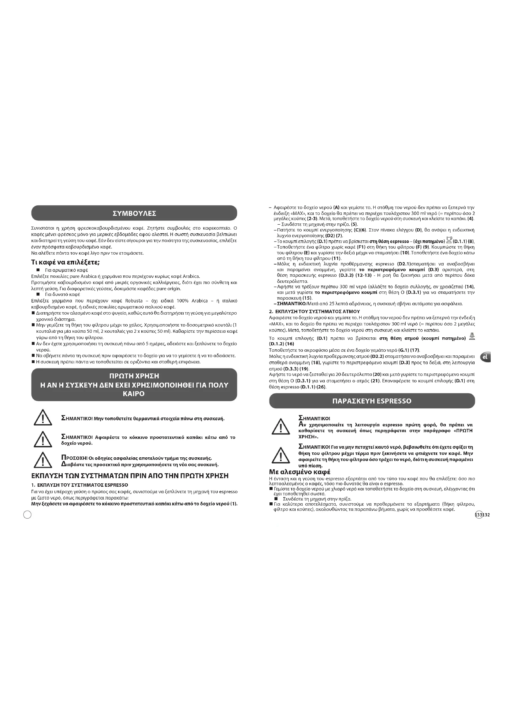 ΠΡΟΣΤΑΣΙΑ ΤΟΥ ΠΕΡΙΒΑΛΛΟΝΤΟΣ Προέχει η προστασία του περιβάλλοντος! Η συσκευή σας περιέχει πολύτιμα υλικά, τα οποία μπορούν να ξαναχρησιμοποιηθούν ή να ανακυκλωθούν. Αφήστε τη σε κάποιο δημοτικό σημείο συλλογής αποβλήτων της περιοχής σας. ΠΡΟΒΛΗΜΑΤΑ ΠΙΘΑΝΕΣ ΑΙΤΙΕΣ ΛΥΣΕΙΣΗ συσκευή δεν λειτουργεί. Η αντλία έχει απενεργοποιηθεί επειδή δεν υπάρχει νερό.Γεμίστε το δοχείο νερού και θέστε ξανά σε λειτουργία την αντλία (ανατρέξτε στην ενότητα: ΠΡΩΤΗ ΧΡΗΣΗ). Μην αφήνετε το δοχείο να αδειάζει τελείως.Το αφαιρούμενο δοχείο νερού δεν έχει τοποθετηθεί σωστά.Τοποθετήστε σωστά το δοχείο νερού.Η συσκευή δεν είναι συνδεδεμένη.Βεβαιωθείτε ότι η συσκευή είναι ενεργοποιημένη.Το ακροφύσιο δεν λειτουργεί ή δημιουργεί λίγο αφρό.Το ακροφύσιο αφρού δεν έχει τοποθετηθεί σωστά.Ελέγξτε αν έχει τοποθετηθεί σωστά το εξάρτημα στη συσκευή: αφαιρέστε και ξανατοποθετήστε το ακροφύσιο στον βραχίονα με μια απότομη κίνηση προς τα πάνω.Το γάλα είναι πολύ ζεστό. Χρησιμοποιήστε φρέσκο, παστεριωμένο ή γάλα UHT που έχετε ανοίξει πρόσφατα.Η κόκκινη λυχνία είναι αναμμένη και η ρύθμιση espresso δεν λειτουργείΤο μπόιλερ νερού είναι υπερβολικά ζεστό για την παρασκευή espresso μετά τη χρήση της λειτουργίας ατμού.Αφήστε τη συσκευή να κρυώσει, ακολουθώντας τις οδηγίες της ενότητας «Χρήσιμες συμβουλές» στη σελίδα 5Αν δεν μπορείτε να βρείτε την αιτία του προβλήματος, απευθυνθείτε σε εξουσιοδοτημένο κατάστημα. Μην αποσυναρμολογείτε ποτέ τη συσκευή! (αν αποσυναρμολογηθεί η συσκευή, ακυρώνεται η εγγύηση).