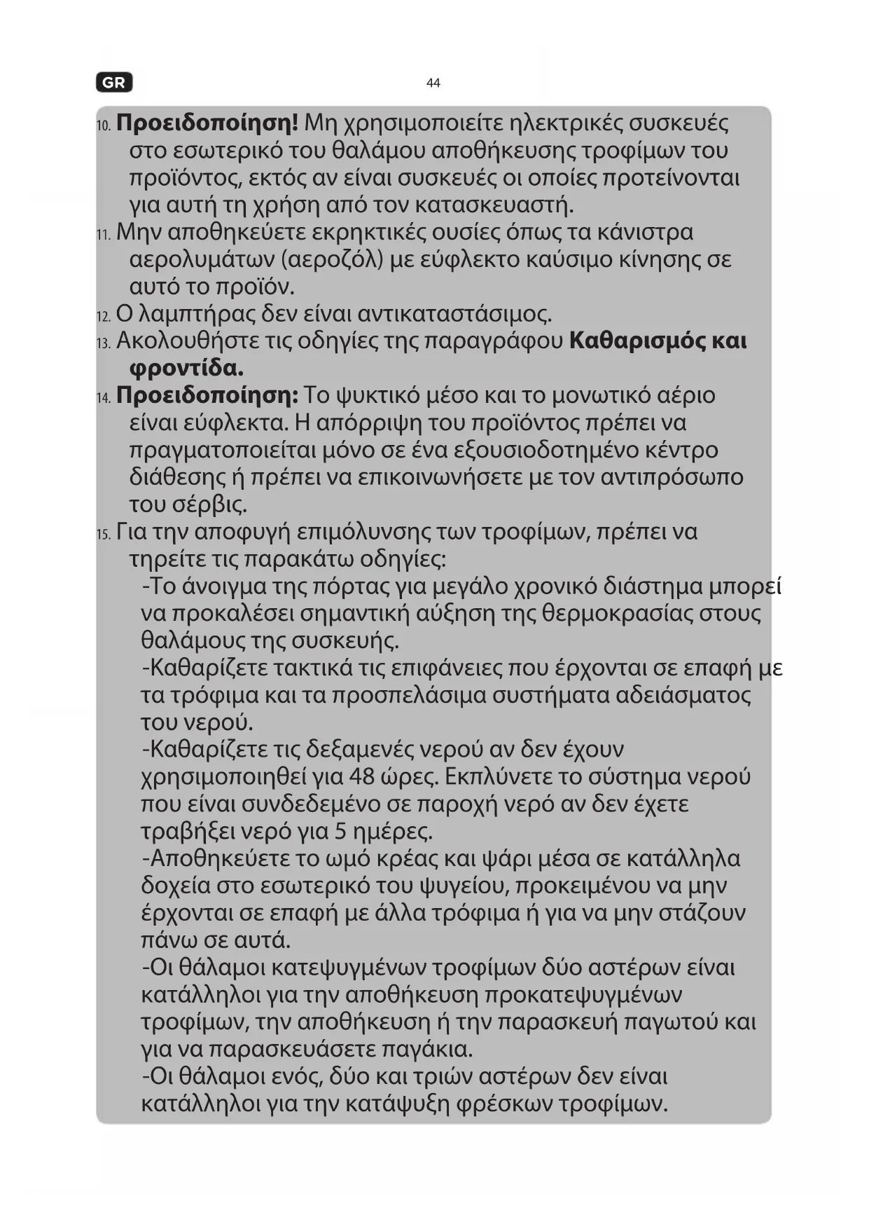 -Καθαρίζετε τις δεξαμενές νερού αν δεν έχουν χρησιμοποιηθεί για 48 ώρες. Εκπλύνετε το σύστημα νερού που είναι συνδεδεμένο σε παροχή νερό αν δεν έχετε τραβήξει νερό για 5 ημέρες. -Αποθηκεύετε το ωμό κρέας και ψάρι μέσα σε κατάλληλα δοχεία στο εσωτερικό του ψυγείου, προκειμένου να μην έρχονται σε επαφή με άλλα τρόφιμα ή για να μην στάζουν πάνω σε αυτά. -Οι θάλαμοι κατεψυγμένων τροφίμων δύο αστέρων είναι κατάλληλοι για την αποθήκευση προκατεψυγμένων τροφίμων, την αποθήκευση ή την παρασκευή παγωτού και για να παρασκευάσετε παγάκια. -Οι θάλαμοι ενός, δύο και τριών αστέρων δεν είναι κατάλληλοι για την κατάψυξη φρέσκων τροφίμων.45
