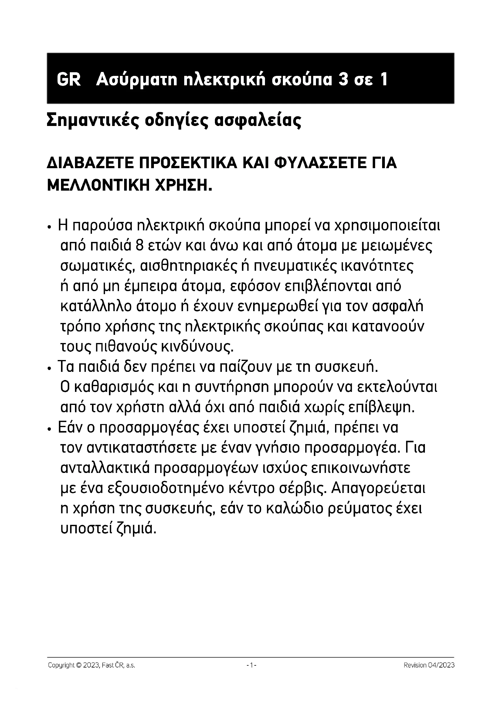 - Μην επισκευάζετε τη σκούπα μόνοι σας και μην πραγματοποιείτε τροποποιήσεις σε αυτήν. Όλες οι επισκευές ή οι τροποποιήσεις πρέπει να εκτελούνται σε εξουσιοδοτημένο κέντρο σέρβις. Επεμβαίνοντας οι ίδιοι στη συσκευή, διατρέχετε τον κίνδυνο να ακυρώσετε τα νόμιμα δικαιώματά σας στο πλαίσιο της εγγύησης για ανεπαρκή απόδοση ή κακή ποιότητα.- 3 - Revision 04/2023 Copyright © 2023, Fast ČR, a.s.