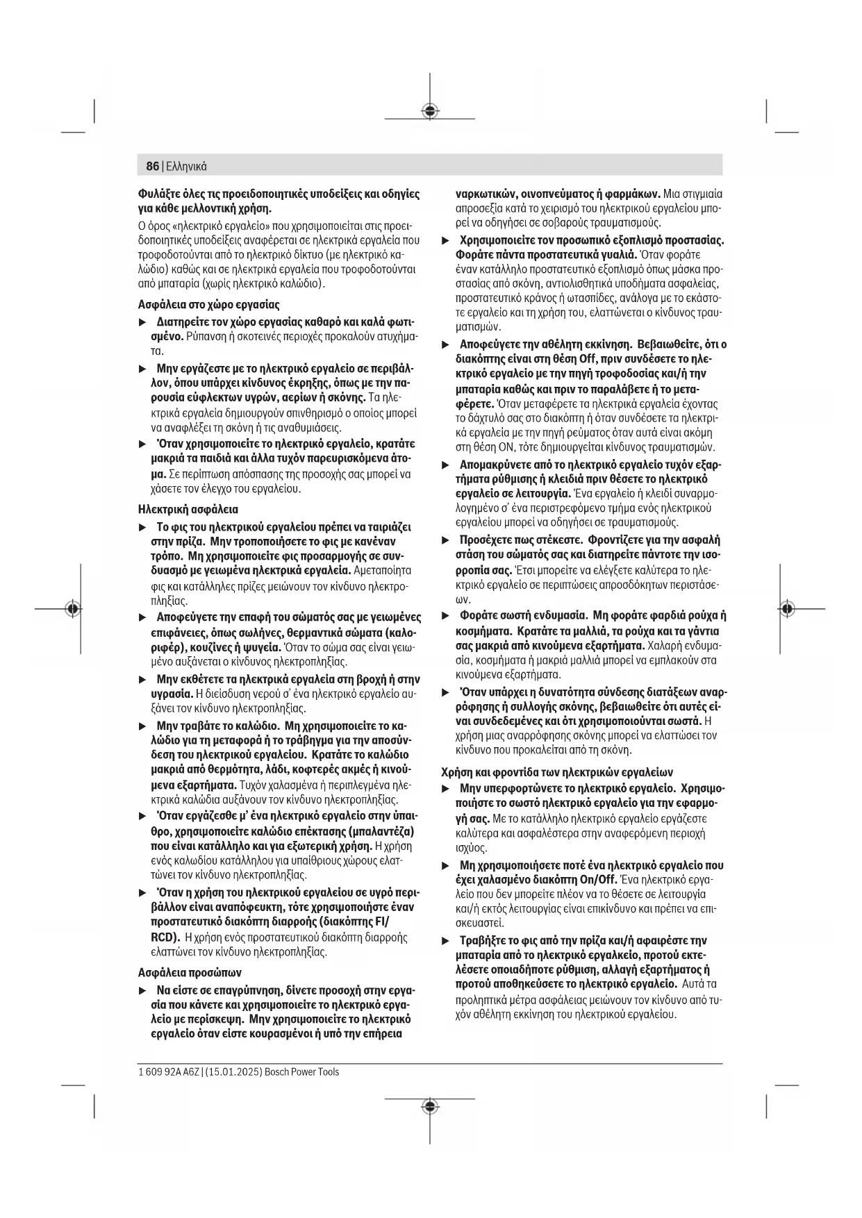 u Τραβήξτε το φις από την πρίζα και/ή αφαιρέστε την μπαταρία από το ηλεκτρικό εργαλκείο, προτού εκτε- λέσετε οποιαδήποτε ρύθμιση, αλλαγή εξαρτήματος ή προτού αποθηκεύσετε το ηλεκτρικό εργαλείο. Αυτά τα προληπτικά μέτρα ασφάλειας μειώνουν τον κίνδυνο από τυ- χόν αθέλητη εκκίνηση του ηλεκτρικού εργαλείου. 1 609 92A A6Z | (15.01.2025) Bosch Power ToolsΕλληνικά | 87 u Φυλάτε τα ηλεκτρικά εργαλεία που δε χρησιμοποιού- νται μακριά από παιδιά και μην επιτρέψετε τη χρήση του ηλεκτρικού εργαλείου σε άτομα που δεν είναι εξοι- κειωμένα με το ηλεκτρικό εργαλείο ή τις οδηγίες για τη λειτουργία του ηλεκτρικού εργαλείου. Τα ηλεκτρικά ερ- γαλεία είναι επικίνδυνα όταν χρησιμοποιούνται από άπειρα