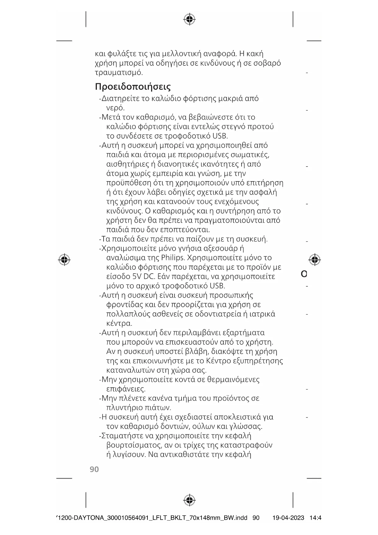Εάν το προϊόν υπερθερμαίνεται ασυνήθιστα ή αναδίδει οσμή, αλλάζει χρώμα ή εάν η φόρτιση διαρκεί περισσότερο από το συνηθισμένο, σταματήστε τη χρήση και τη φόρτιση του προϊόντος και επικοινωνήστε με τη Philips. HY1200-DAYTONA_300010564091_LFLT_BKLT_70x148mm_BW.indd 90HY1200-DAYTONA_300010564091_LFLT_BKLT_70x148mm_BW.indd 90 19-04-2023 14:4919-04-2023 14:4991 και φυλάξτε τις για μελλοντική αναφορά. Η κακή χρήση μπορεί να οδηγήσει σε κινδύνους ή σε σοβαρό τραυματισμό. Προειδοποιήσεις - Διατηρείτε το καλώδιο φόρτισης μακριά από