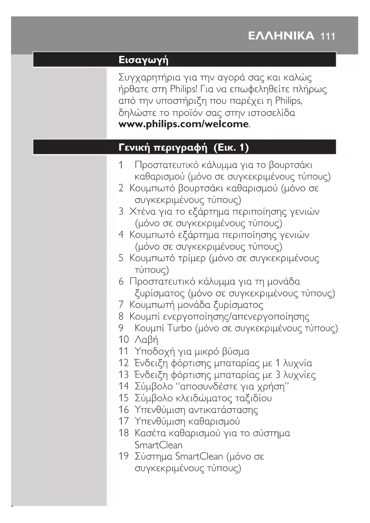 Συγχαρητήρια για την αγορά σας και καλώς ήρθατε στη Philips! Για να επωφεληθείτε πλήρως από την υποστήριξη που παρέχει η Philips, δηλώστε το προϊόν σας στην ιστοσελίδα www.philips.com/welcome. Γενική περιγραφή (Εικ. 1)