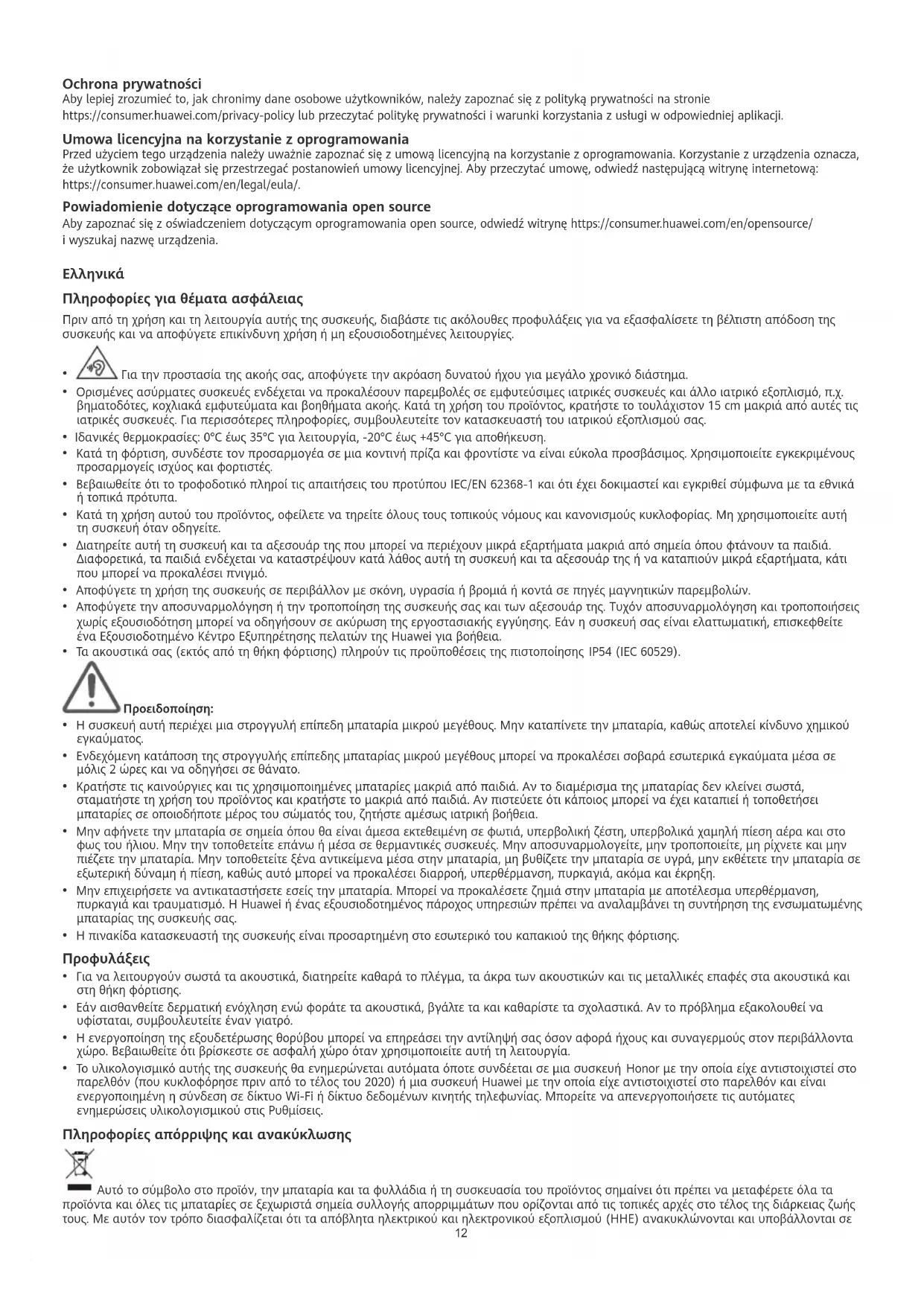 - Το υλικολογισμικό αυτής της συσκευής θα ενημερώνεται αυτόματα όποτε συνδέεται σε μια συσκευή Honor με την οποία είχε αντιστοιχιστεί στο παρελθόν (που κυκλοφόρησε πριν από το τέλος του 2020) ή μια συσκευή Huawei με την οποία είχε αντιστοιχιστεί στο παρελθόν και είναι ενεργοποιημένη η σύνδεση σε δίκτυο Wi-Fi ή δίκτυο δεδομένων κινητής τηλεφωνίας. Μπορείτε να απενεργοποιήσετε τις αυτόματες ενημερώσεις υλικολογισμικού στις Ρυθμίσεις. Πληροφορίες απόρριψης και ανακύκλωσης Αυτό το σύμβολο στο προϊόν, την μπαταρία και τα φυλλάδια ή τη συσκευασία του προϊόντος σημαίνει ότι πρέπει να μεταφέρετε όλα τα προϊόντα και όλες τις μπαταρίες σε ξεχωριστά σημεία συλλογής απορριμμάτων που ορίζονται από τις τοπικές αρχές στο τέλος της διάρκειας ζωής τους. Με αυτόν τον τρόπο διασφαλίζεται ότι τα απόβλητα ηλεκτρικού και ηλεκτρονικού εξοπλισμού (ΗΗΕ) ανακυκλώνονται και υποβάλλονται σε 12επεξεργασία με τρόπο που διατηρεί τα πολύτιμα υλικά και προστατεύει την ανθρώπινη υγεία και το περιβάλλον. Για περισσότερες πληροφορίες, επικοινωνήστε με τις τοπικές αρχές, τον μεταπωλητή ή την υπηρεσία απόρριψης οικιακών απορριμμάτων ή επισκεφτείτε τον ιστότοπο https://consumer.huawei.com/en/. Συμμόρφωση προς τις κανονιστικές διατάξεις της ΕΕ Διά του παρόντος, η Huawei Device Co., Ltd. δηλώνει ότι η συγκεκριμένη συσκευή T0018/T0018C συμμορφώνεται με τα παρακάτω: οδηγία 2014/53/EΕ για τον ραδιοεξοπλισμό (RED), οδηγία 2011/65/ΕΕ για τον περιορισμό της χρήσης ορισμένων επικίνδυνων ουσιών σε ηλεκτρικό και ηλεκτρονικό εξοπλισμό (RoHS), με τον κανονισμό της ΕΕ για την καταχώριση, αξιολόγηση, αδειοδότηση και τους περιορισμούς των χημικών προϊόντων (REACH) και με την οδηγία για τις μπαταρίες (όπου περιλαμβάνονται). Το πλήρες κείμενο της δήλωσης συμμόρφωσης ΕΕ και οι πιο πρόσφατες πληροφορίες σχετικά με τα αξεσουάρ και το λογισμικό διατίθενται στην παρακάτω διεύθυνση στο Ίντερνετ: https://consumer.huawei.com/certication