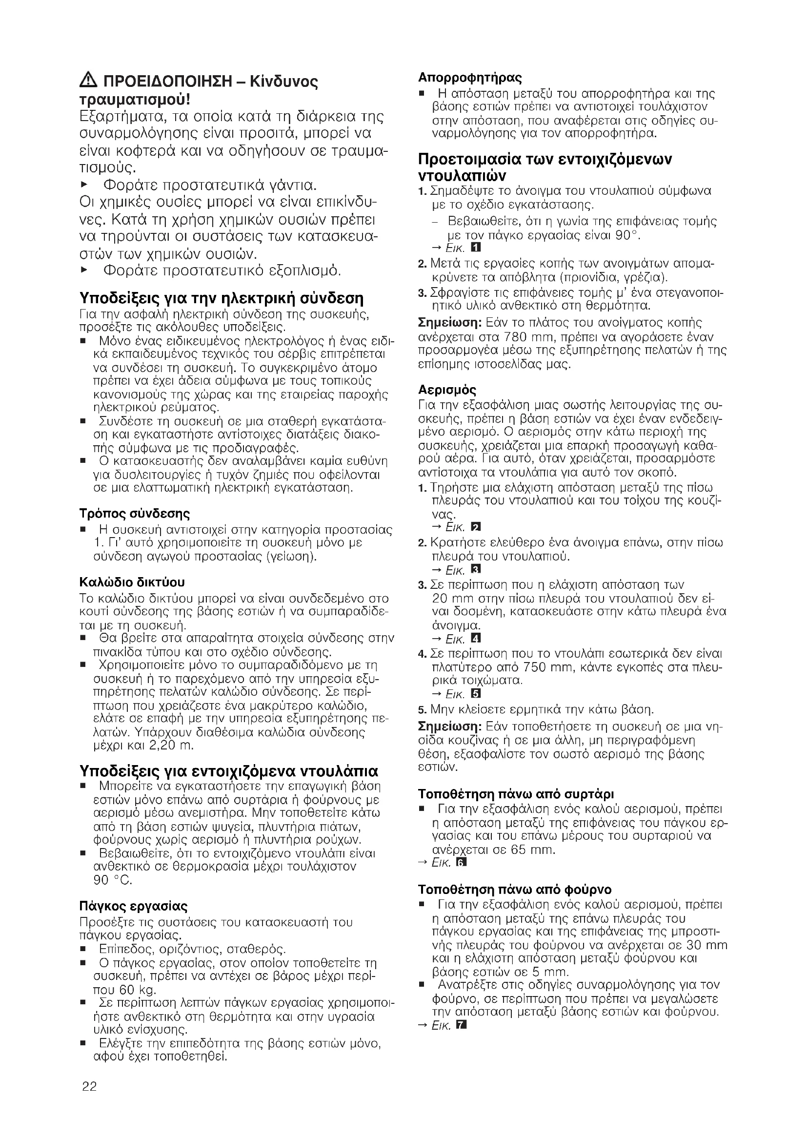 σύνδεση αγωγού προστασίας (γείωση). Καλώδιο δικτύου Το καλώδιο δικτύου μπορεί να είναι συνδεδεμένο στο κουτί σύνδεσης της βάσης εστιών ή να συμπαραδίδε- ται με τη συσκευή. ¡ Θα βρείτε στα απαραίτητα στοιχεία σύνδεσης στην πινακίδα τύπου και στο σχέδιο σύνδεσης. ¡ Χρησιμοποιείτε μόνο το συμπαραδιδόμενο με τη συσκευή ή το παρεχόμενο από την υπηρεσία εξυ- πηρέτησης πελατών καλώδιο σύνδεσης. Σε περί- πτωση που χρειάζεστε ένα μακρύτερο καλώδιο, ελάτε σε επαφή με την υπηρεσία εξυπηρέτησης πε- λατών. Υπάρχουν διαθέσιμα καλώδια σύνδεσης μέχρι και 2,20m. Υποδείξεις για εντοιχιζόμενα ντουλάπια ¡ Μπορείτε να εγκαταστήσετε την επαγωγική βάση εστιών μόνο επάνω από συρτάρια ή φούρνους με αερισμό μέσω ανεμιστήρα. Μην τοποθετείτε κάτω από τη βάση εστιών ψυγεία, πλυντήρια πιάτων, φούρνους χωρίς αερισμό ή πλυντήρια ρούχων. ¡ Βεβαιωθείτε, ότι το εντοιχιζόμενο ντουλάπι είναι ανθεκτικό σε θερμοκρασία μέχρι τουλάχιστον 90°C. Πάγκος εργασίας Προσέξτε τις συστάσεις του κατασκευαστή του πάγκου εργασίας. ¡ Επίπεδος, οριζόντιος, σταθερός. ¡ Ο πάγκος εργασίας, στον οποίον τοποθετείτε τη συσκευή, πρέπει να αντέχει σε βάρος μέχρι περί- που 60kg. ¡ Σε περίπτωση λεπτών πάγκων εργασίας χρησιμοποι- ήστε ανθεκτικό στη θερμότητα και στην υγρασία υλικό ενίσχυσης. ¡ Ελέγξτε την επιπεδότητα της βάσης εστιών μόνο, αφού έχει τοποθετηθεί. Απορροφητήρας ¡ Η απόσταση μεταξύ του απορροφητήρα και της βάσης εστιών πρέπει να αντιστοιχεί τουλάχιστον στην απόσταση, που αναφέρεται στις οδηγίες συ- ναρμολόγησης για τον απορροφητήρα. Προετοιμασία των εντοιχιζόμενων