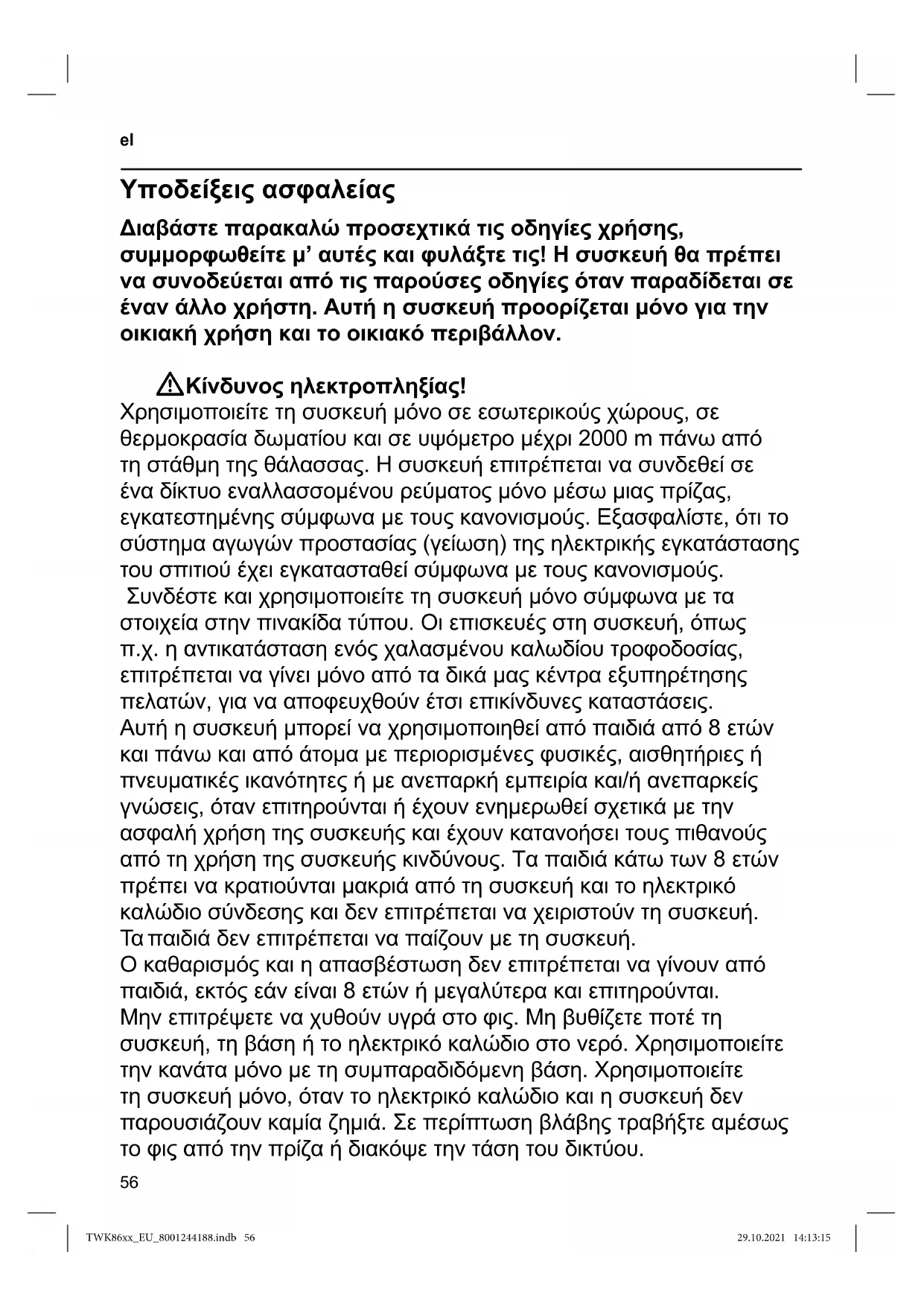ΠΡΟΕΙΔΟΠΟΙΗΣΗ: Μη χρησιμοποιείτε αυτή τη συσκευή κοντά σε μπανιέρες, ντους, νιπτήρες ή κοντά σε άλλα δοχεία που περιέχουν νερό. WΚίνδυνος ασφυξίας! Μην αφήνετε τα παιδιά να παίζουν με το υλικό συσκευασίας. WΚίνδυνος τραυματισμού! Η λάθος χρήση της συσκευής μπορεί να οδηγήσει σε τραυματισμούς. WΠροσοχή! Καθαρισμός των επιφανειών που έρχονται σε επαφή με τρόφιμα! Προσέξτε τις ειδικές υποδείξεις για τον καθαρισμό στις οδηγίες. TWK86xx_EU_8001244188.indb 56TWK86xx_EU_8001244188.indb 56 29.10.2021 14:13:1529.10.2021 14:13:1557