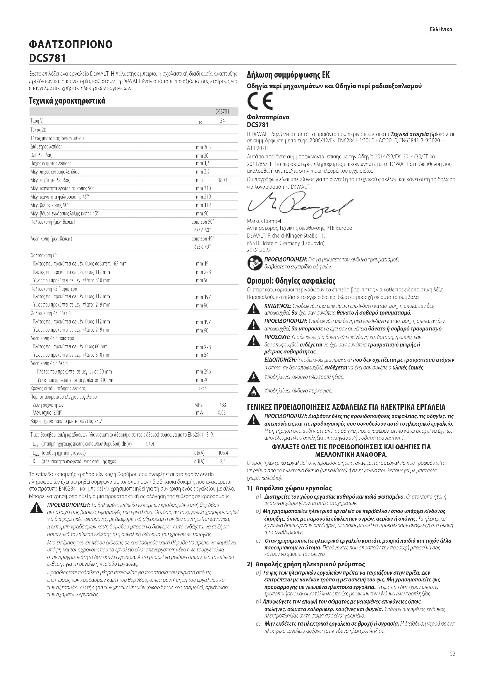 ΠΡΟΕΙΔΟΠΟΙΗΣΗ: Το δηλωμένο επίπεδο εκπομπών κραδασμών και/ή θορύβου αντιστοιχεί στις βασικές εφαρμογές του εργαλείου. Ωστόσο, αν το εργαλείο χρησιμοποιηθεί για διαφορετικές εφαρμογές, με διαφορετικά αξεσουάρ ή αν δεν συντηρείται κανονικά, η εκπομπή κραδασμών και/ή θορύβου μπορεί να διαφέρει. Αυτό ενδέχεται να αυξήσει σημαντικά το επίπεδο έκθεσης στη συνολική διάρκεια του χρόνουλειτουργίας. Μια εκτίμηση του επιπέδου έκθεσης σε κραδασμούς και/ή θόρυβο θα πρέπει να λαμβάνει υπόψη και τους χρόνους που το εργαλείο είναι απενεργοποιημένο ή λειτουργεί αλλά στην πραγματικότητα δεν εκτελεί εργασία. Αυτό μπορεί να μειώσει σημαντικά το επίπεδο έκθεσης για τη συνολική περίοδοεργασίας. Προσδιορίστε πρόσθετα μέτρα ασφαλείας για προστασία του χειριστή από τις επιπτώσεις των κραδασμών και/ή του θορύβου, όπως: συντήρηση του εργαλείου και των αξεσουάρ, διατήρηση των χεριών θερμών (αφορά τους κραδασμούς), οργάνωση τωνσχημάτωνεργασίας. Δήλωση συμμόρφωσης ΕΚ Οδηγία περί μηχανημάτων και Οδηγία περί ραδιοεξοπλισμού Φαλτσοπρίονο DCS781 Η DeWALT δηλώνει ότι αυτά τα προϊόντα που περιγράφονται στα Τεχνικά στοιχεία βρίσκονται σε συμμόρφωση με τα εξής: 2006/42/ΕΚ, EN62841‑1:2015 +AC:2015; EN62841‑3‑9:2020 + A11:2020. Αυτά τα προϊόντα συμμορφώνονται επίσης με την Οδηγία 2014/53/ΕΚ, 2014/30/ΕΕ και 2011/65/ΕΕ. Για περισσότερες πληροφορίες επικοινωνήστε με τη DeWALT στη διεύθυνση που ακολουθεί ή ανατρέξτε στην πίσω πλευρά τουεγχειριδίου. Ο υπογράφων είναι υπεύθυνος για τη σύνταξη του τεχνικού φακέλου και κάνει αυτή τη δήλωση για λογαριασμό τηςDeWALT. Markus Rompel Αντιπρόεδρος Τεχνικής διεύθυνσης, PTE‑Europe DeWALT, Richard‑Klinger‑Straße 11, 65510, Idstein, Germany (Γερμανία)