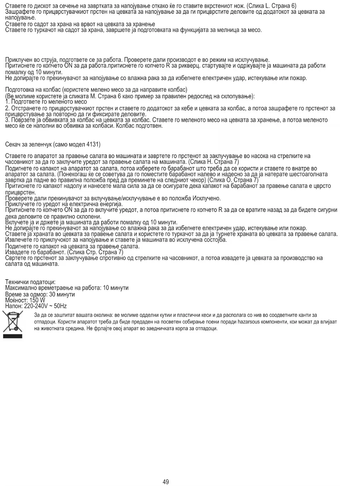 2. Αφαιρέστε τον δακτύλιο στερέωσης και βάλτε το εξάρτημα κεμπέ & το σωλήνα λουκάνικου και μετά βιδώστε τον δακτύλιο στερέωσης για να στερεώσετε ξανά τα εξαρτήματα. 3. Συνδέστε το περιτύλιγμα του λουκάνικου στο σωληνάριο λουκάνικου. Βάλτε τον κιμά σε σωληνάριο τροφοδοσίας και στη συνέχεια ο κιμάς θα γεμιστεί σε περιτύλιγμα λουκάνικου. Λουκάνικο έτοιμο.53 Προστασία του περιβάλλοντος Η χάρτινη συσκευασία παρακαλούμε να παραδοθεί για ανακύκλωση. Τις σακούλες από πολυαιθυλένιο να τις πετάτε σε κατάλληλα δοχεία. Τις παλιές συσκευές πρέπει να αποσύρετε με κατάλληλες διαδικασίες συγκέντρωσης αποβλήτων, διότι επικίνδυνα συστατικά της συσκευής Κόφτης λαχανικών (μόνο μοντέλο 4131) Τοποθετήστε τη σαλατιέρα στο μηχάνημα και περιστρέψτε τον δακτύλιο ασφάλισης δεξιόστροφα για να κλειδώσετε τη συσκευή σαλατιέρα στη μηχανή. (Εικόνα Ν. Σελίδα 7) Σηκώστε το κάλυμμα της σαλατιέρας, επιλέξτε το τύμπανο που πρέπει να χρησιμοποιήσετε και τοποθετήστε το μέσα στη σαλατιέρα. (Μερικές φορές θα σας συμβουλεύουμε να μετακινήσετε το τύμπανο αριστερά και δεξιά για να πέσει η εξαγωνική βίδα στη σωστή θέση πριν προχωρήσετε στο επόμενο βήμα) (Εικόνα O. Σελίδα 7) Πιέστε το καπάκι προς τα κάτω και ασκήστε ελαφρά δύναμη για να βεβαιωθείτε ότι το καπάκι του τυμπάνου σαλατιέρα είναι καλά στερεωμένο. Βεβαιωθείτε ότι ο διακόπτης On / Off είναι στη θέση Off. Συνδέστε τη συσκευή στο ρεύμα. Πιέστε προς τα κάτω το κουμπί ON για να ενεργοποιήσετε τη συσκευή και, στη συνέχεια, πατήστε το κουμπί R για να επιστρέψετε για να βεβαιωθείτε ότι τα εξαρτήματα έχουν συναρμολογηθεί σωστά. Ξεκινήστε και διατηρήστε το μηχάνημα σε λειτουργία για λιγότερο από 10 λεπτά. Μην αγγίζετε το διακόπτη λειτουργίας με βρεγμένο χέρι για να αποφύγετε ηλεκτροπληξία, διαρροή ή πυρκαγιά. Τοποθετήστε το φαγητό στο σωληνάριο σαλατιέρα και χρησιμοποιήστε το σπρώξιμο για να σπρώξετε το φαγητό μέσα στο σωληνάριο του