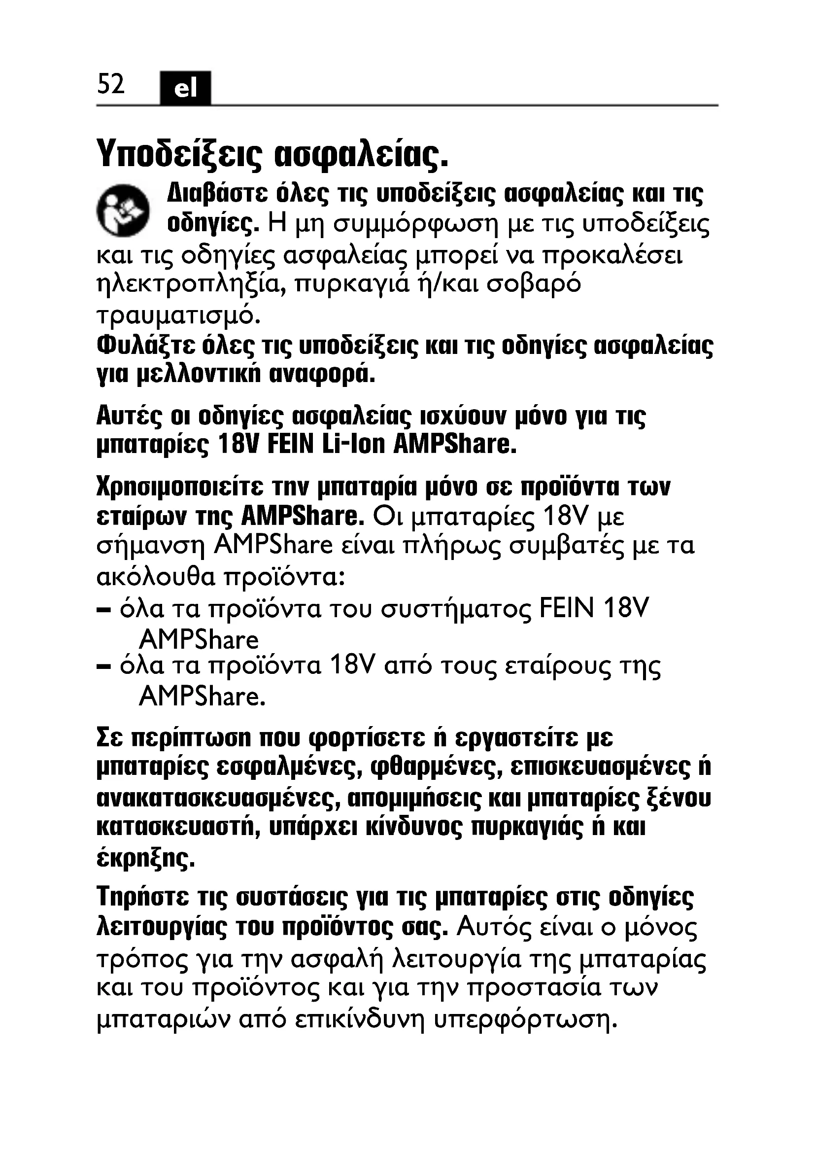 Υποδείξεις ασφαλείας. Διαβάστε όλες τις υποδείξεις ασφαλείας και τις οδηγίες. Η μη συμμόρφωση με τις υποδείξεις και τις οδηγίες ασφαλείας μπορεί να προκαλέσει ηλεκτροπληξία, πυρκαγιά ή/και σοβαρό τραυματισμό. Φυλάξτε όλες τις υποδείξεις και τις οδηγίες ασφαλείας για μελλοντική αναφορά. Αυτές οι οδηγίες ασφαλείας ισχύουν μόνο για τις μπαταρίες 18V FEIN Li-Ion AMPShare. Χρησιμοποιείτε την μπαταρία μόνο σε προϊόντα των εταίρων της AMPShare. Οι μπαταρίες 18V με σήμανση AMPShare είναι πλήρως συμβατές με τα ακόλουθα προϊόντα: – όλα τα προϊόντα του συστήματος FEIN 18V AMPShare – όλα τα προϊόντα 18V από τους εταίρους της AMPShare. Σε περίπτωση που φορτίσετε ή εργαστείτε με μπαταρίες εσφαλμένες, φθαρμένες, επισκευασμένες ή ανακατασκευασμένες, απομιμήσεις και μπαταρίες ξένου κατασκευαστή, υπάρχει κίνδυνος πυρκαγιάς ή και