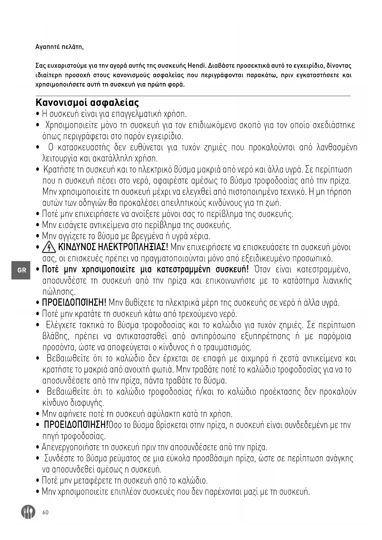 Αγαπητέ πελάτη, Σας ευχαριστούμε για την αγορά αυτής της συσκευής Hendi. Διαβάστε προσεκτικά αυτό το εγχειρίδιο, δίνοντας ιδιαίτερη προσοχή στους κανονισμούς ασφαλείας που περιγράφονται παρακάτω, πριν εγκαταστήσετε και χρησιμοποιήσετε αυτή τη συσκευή για πρώτη φορά. Κανονισμοί ασφαλείας