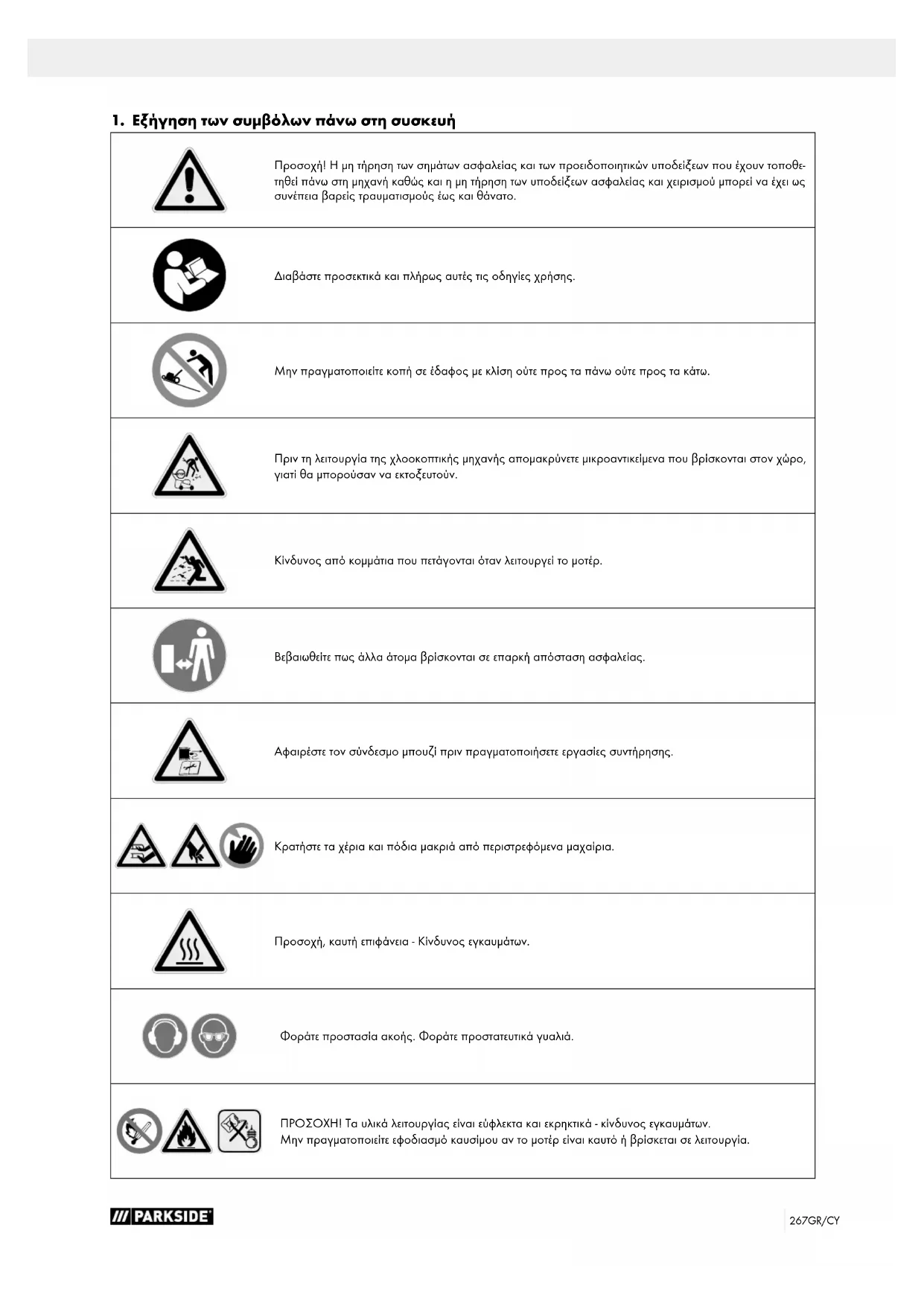 Προσοχή! Η μη τήρηση των σημάτων ασφαλείας και των προειδοποιητικών υποδείξεων που έχουν τοποθε- τηθεί πάνω στη μηχανή καθώς και η μη τήρηση των υποδείξεων ασφαλείας και χειρισμού μπορεί να έχει ως συνέπεια βαρείς τραυματισμούς έως και θάνατο. Διαβάστε προσεκτικά και πλήρως αυτές τις οδηγίες χρήσης. Μην πραγματοποιείτε κοπή σε έδαφος με κλίση ούτε προς τα πάνω ούτε προς τα κάτω. Πριν τη λειτουργία της χλοοκοπτικής μηχανής απομακρύνετε μικροαντικείμενα που βρίσκονται στον χώρο, γιατί θα μπορούσαν να εκτοξευτούν. Κίνδυνος από κομμάτια που πετάγονται όταν λειτουργεί το μοτέρ. Βεβαιωθείτε πως άλλα άτομα βρίσκονται σε επαρκή απόσταση ασφαλείας. Αφαιρέστε τον σύνδεσμο μπουζί πριν πραγματοποιήσετε εργασίες συντήρησης. Κρατήστε τα χέρια και πόδια μακριά από περιστρεφόμενα μαχαίρια. Προσοχή, καυτή επιφάνεια - Κίνδυνος εγκαυμάτων. Φοράτε προστασία ακοής. Φοράτε προστατευτικά γυαλιά. ΠΡΟΣΟΧΗ! Τα υλικά λειτουργίας είναι εύφλεκτα και εκρηκτικά - κίνδυνος εγκαυμάτων. Μην πραγματοποιείτε εφοδιασμό καυσίμου αν το μοτέρ είναι καυτό ή βρίσκεται σε λειτουργία.268 GR/CY Χωρητικότητα ρεζερβουάρ Λάδι κινητήρα