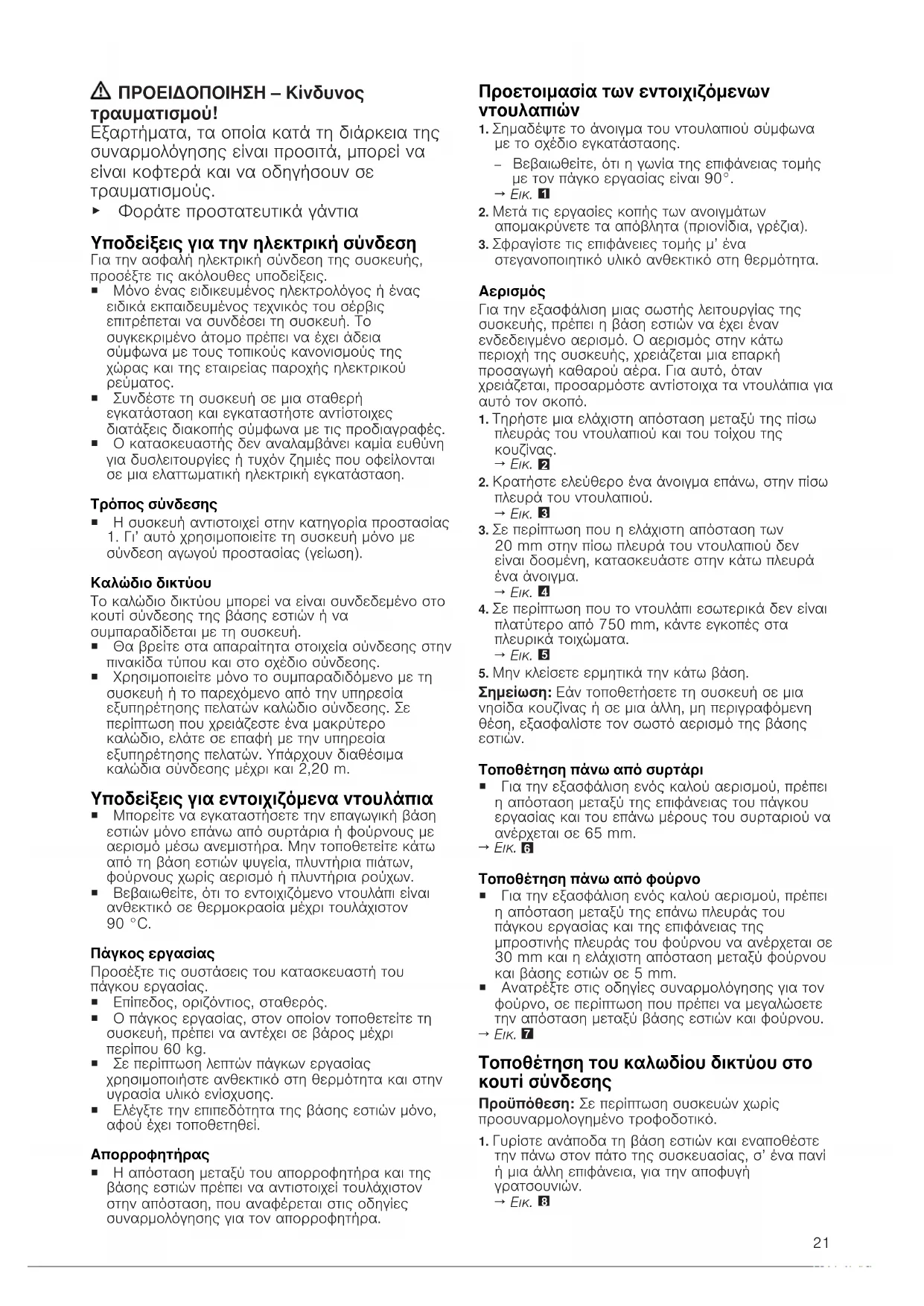 σύνδεση αγωγού προστασίας (γείωση). Καλώδιο δικτύου Το καλώδιο δικτύου μπορεί να είναι συνδεδεμένο στο κουτί σύνδεσης της βάσης εστιών ή να συμπαραδίδεται με τη συσκευή. ¡ Θα βρείτε στα απαραίτητα στοιχεία σύνδεσης στην πινακίδα τύπου και στο σχέδιο σύνδεσης. ¡ Χρησιμοποιείτε μόνο το συμπαραδιδόμενο με τη συσκευή ή το παρεχόμενο από την υπηρεσία εξυπηρέτησης πελατών καλώδιο σύνδεσης. Σε περίπτωση που χρειάζεστε ένα μακρύτερο καλώδιο, ελάτε σε επαφή με την υπηρεσία εξυπηρέτησης πελατών. Υπάρχουν διαθέσιμα καλώδια σύνδεσης μέχρι και 2,20m. Υποδείξεις για εντοιχιζόμενα ντουλάπια ¡ Μπορείτε να εγκαταστήσετε την επαγωγική βάση εστιών μόνο επάνω από συρτάρια ή φούρνους με αερισμό μέσω ανεμιστήρα. Μην τοποθετείτε κάτω από τη βάση εστιών ψυγεία, πλυντήρια πιάτων, φούρνους χωρίς αερισμό ή πλυντήρια ρούχων. ¡ Βεβαιωθείτε, ότι το εντοιχιζόμενο ντουλάπι είναι ανθεκτικό σε θερμοκρασία μέχρι τουλάχιστον 90°C. Πάγκος εργασίας Προσέξτε τις συστάσεις του κατασκευαστή του πάγκου εργασίας. ¡ Επίπεδος, οριζόντιος, σταθερός. ¡ Ο πάγκος εργασίας, στον οποίον τοποθετείτε τη συσκευή, πρέπει να αντέχει σε βάρος μέχρι περίπου 60kg. ¡ Σε περίπτωση λεπτών πάγκων εργασίας χρησιμοποιήστε ανθεκτικό στη θερμότητα και στην υγρασία υλικό ενίσχυσης. ¡ Ελέγξτε την επιπεδότητα της βάσης εστιών μόνο, αφού έχει τοποθετηθεί. Απορροφητήρας ¡ Η απόσταση μεταξύ του απορροφητήρα και της βάσης εστιών πρέπει να αντιστοιχεί τουλάχιστον στην απόσταση, που αναφέρεται στις οδηγίες συναρμολόγησης για τον απορροφητήρα. Προετοιμασία των εντοιχιζόμενων