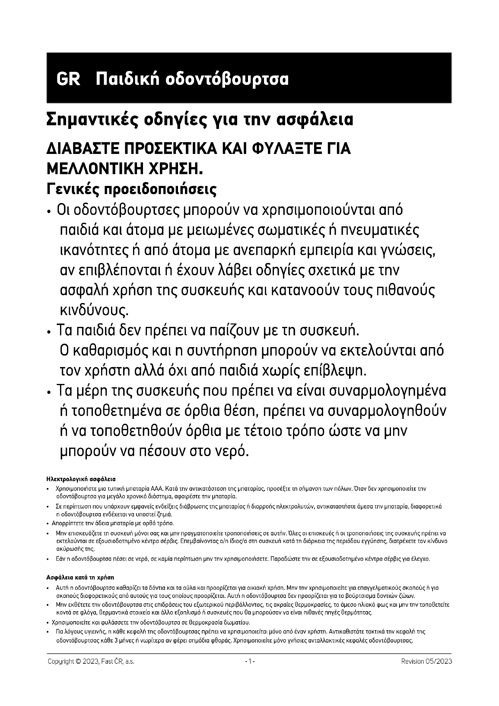 Παιδική οδοντόβουρτσα Εγχειρίδιο χρήσης- 4 - Revision 05/2023 Copyright © 2023, Fast ČR, a.s.