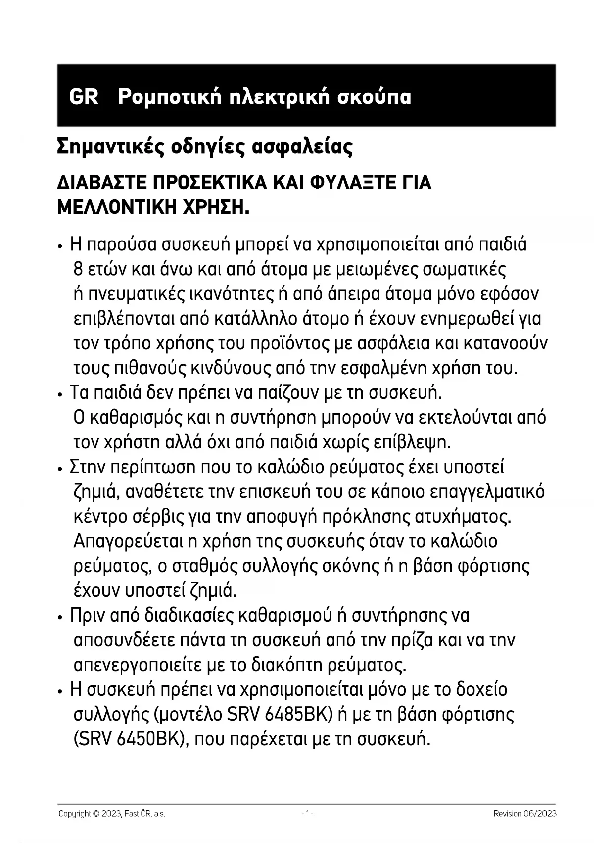 - Ή συσκευή πρέπει να χρησιμοποιείται μόνο με το δοχείο συλλογής (μοντέλο SRV 6485BK) ή με τη βάση φόρτισης (SRV 6450BK), που παρέχεται με τη συσκευή.- 2 - Revision 06/2023 Copyright © 2023, Fast ČR, a.s. ΠΡΟΕΙΔΟΠΟΙΗΣΗ: Μην χρησιμοποιείτε τη δοχείο συλλογής σκόνης της βάσης φόρτισης για τη φόρτιση μπαταριών ή συσκευών για τις οποίες δεν προορίζεται. Ο σταθμός συλλογής σκόνης ή η βάση φόρτισης συνδέεται μόνο με πρίζα που διαθέτει προστατευτικό ασφαλείας. Ηλεκτρολογική ασφάλεια