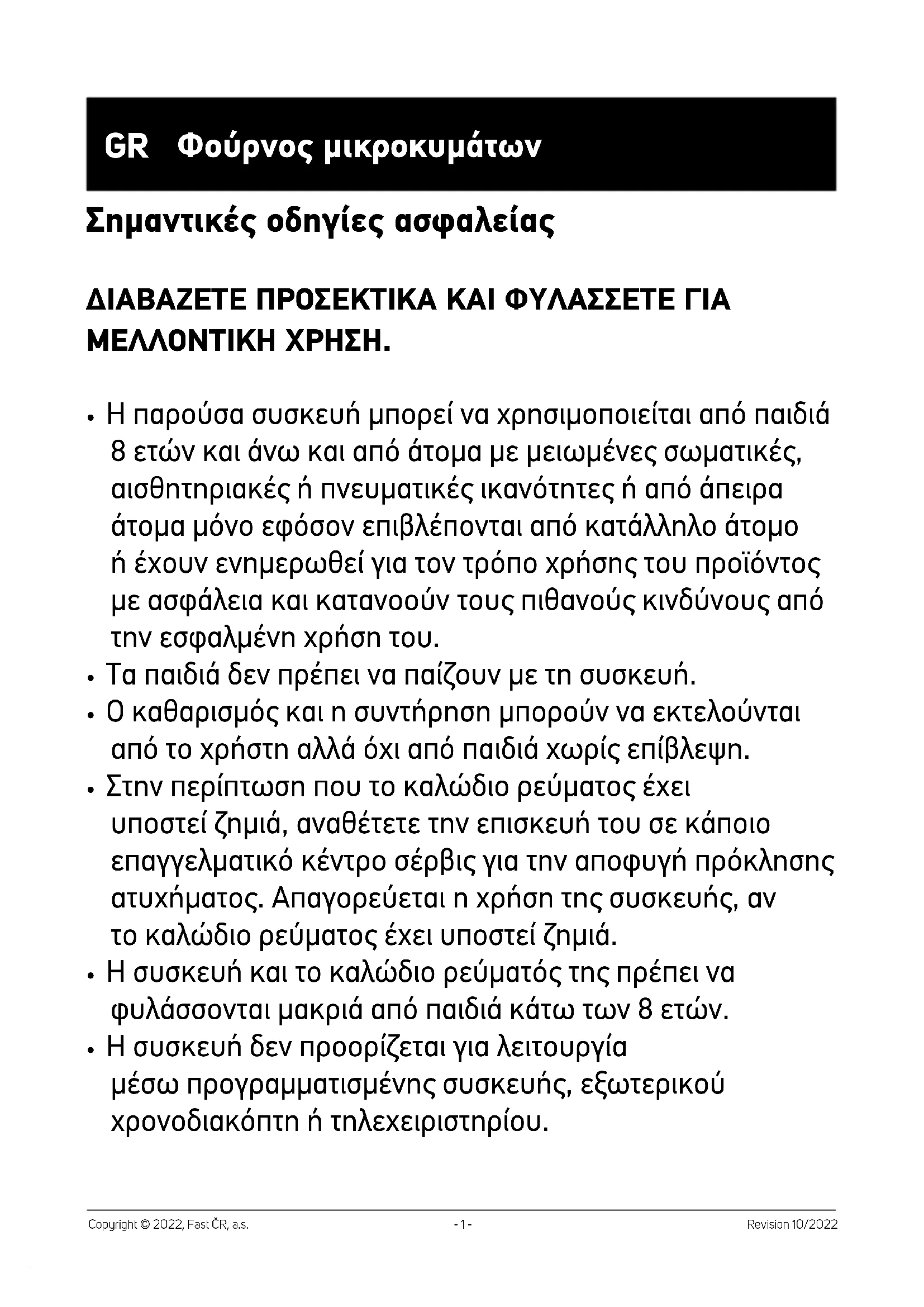 - Το ζέσταμα ροφημάτων στο φούρνο μικροκυμάτων μπορεί να προκαλέσει καθυστερημένο βρασμό, γι' αυτό πρέπει να- 4 - Revision 10/2022 Copyright © 2022, Fast ČR, a.s. είστε προσεκτικοί κατά το χειρισμό του δοχείου. Για αυτό, να δίνετε ιδιαίτερη προσοχή κατά το χειρισμό του δοχείου.