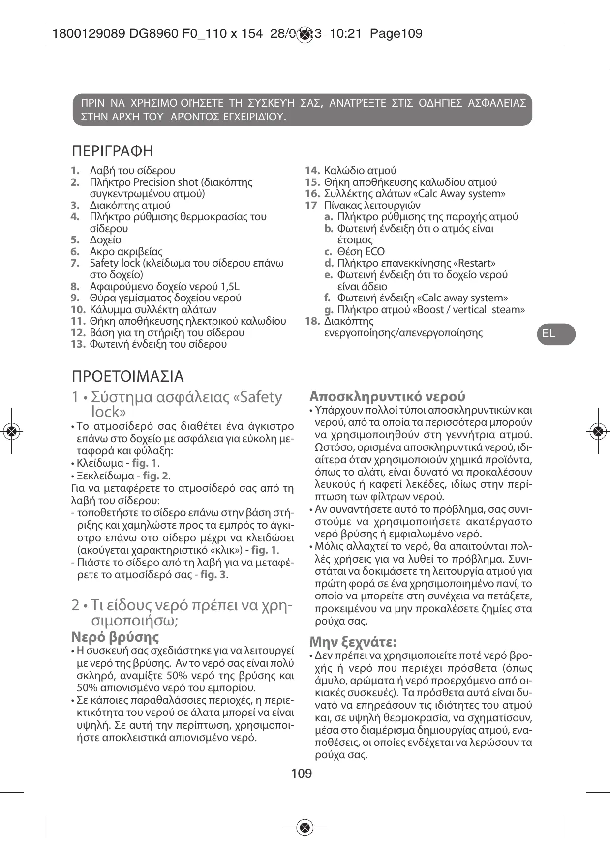 1800129089 DG8960 F0_110 x 154 28/01/13 10:21 Page109 ΠΡΙΝ ΝΑ ΧΡΗΣΙΜΟ ΟΙΉΣΕΤΕ ΤΗ ΣΥΣΚΕΥΉ ΣΑΣ, ΑΝΑΤΡΈΞΤΕ ΣΤΙΣ ΟΔΗΓΊΕΣ ΑΣΦΑΛΕΊΑΣ ΣΤΗΝ ΑΡΧΉ ΤΟΥ ΑΡΌΝΤΟΣ ΕΓΧΕΙΡΙΔΊΟΥ. ΠΕΡΙΓΡΑΦH