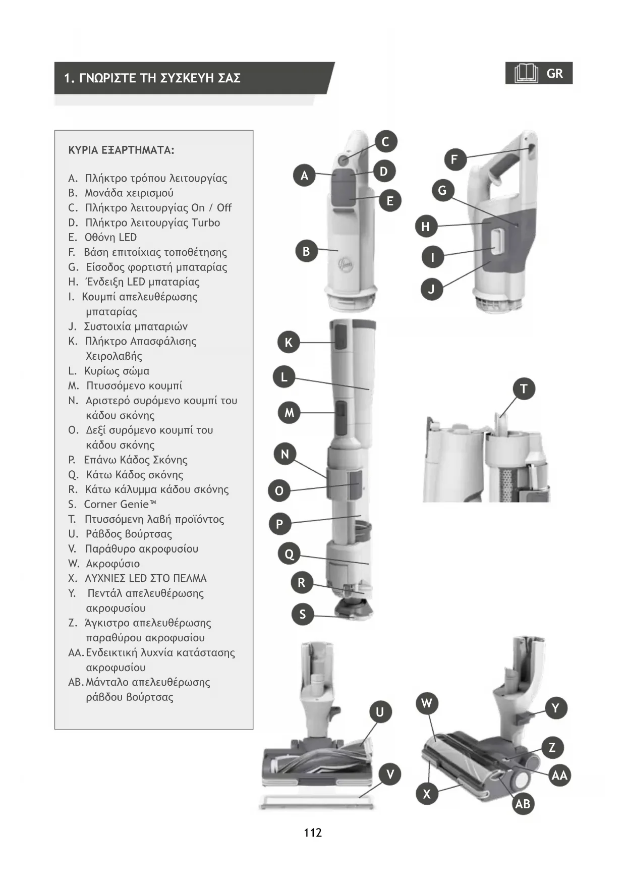 L. Κυρίως σώμα M. Πτυσσόμενο κουμπί N. Αριστερό συρόμενο κουμπί του κάδου σκόνης O. Δεξί συρόμενο κουμπί του κάδου σκόνης P. Επάνω Κάδος Σκόνης Q. Κάτω Κάδος σκόνης R. Κάτω κάλυμμα κάδου σκόνης S. Corner Genie™ T. Πτυσσόμενη λαβή προϊόντος U. Ράβδος βούρτσας