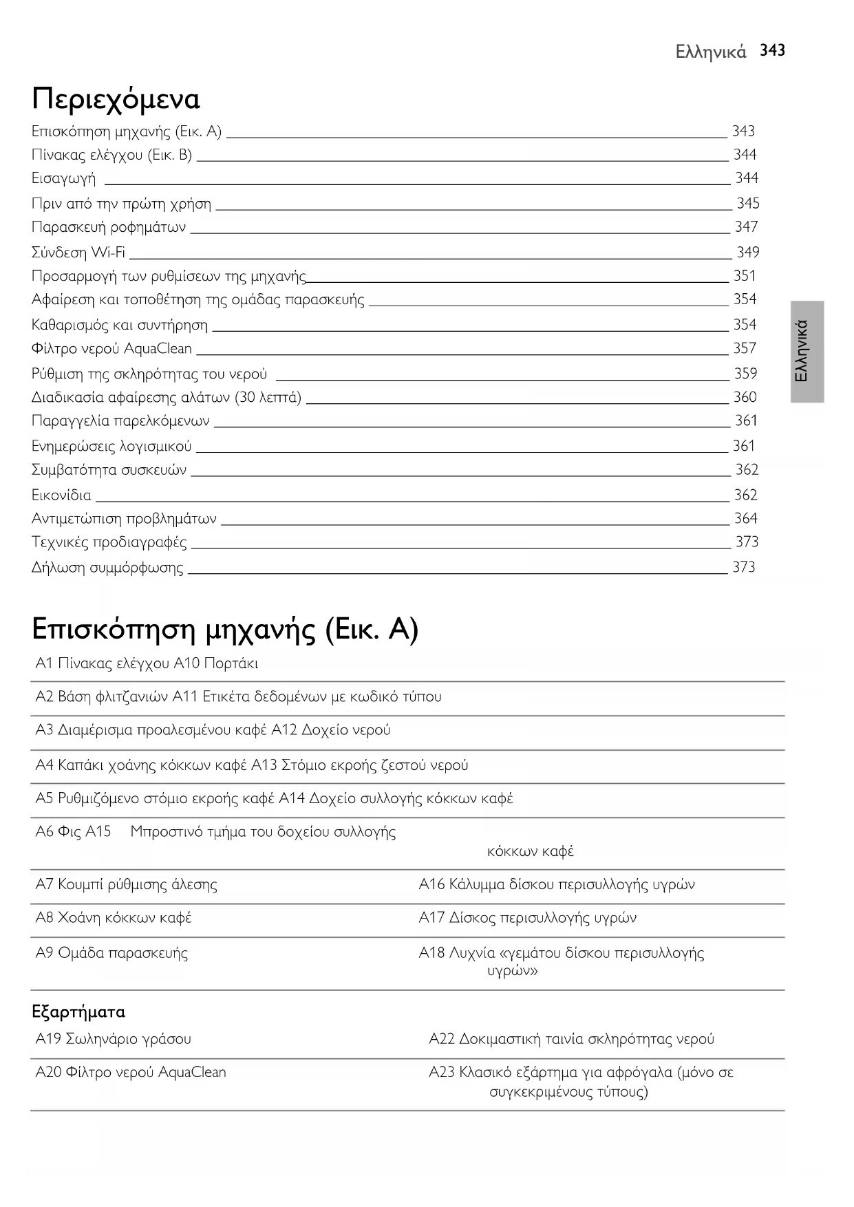 Περιεχόμενα Επισκόπηση μηχανής (Εικ. Α) ________________________________________________________________ 343 Πίνακας ελέγχου (Εικ. B) ____________________________________________________________________ 344 Εισαγωγή ________________________________________________________________________________ 344 Πριν από την πρώτη χρήση __________________________________________________________________ 345 Παρασκευή ροφημάτων _____________________________________________________________________ 347 Σύνδεση Wi-Fi _____________________________________________________________________________ 349 Προσαρμογή των ρυθμίσεων της μηχανής______________________________________________________ 351 Αφαίρεση και τοποθέτηση της ομάδας παρασκευής ______________________________________________ 354 Καθαρισμός και συντήρηση __________________________________________________________________ 354 Φίλτρο νερού AquaClean ____________________________________________________________________ 357 Ρύθμιση της σκληρότητας του νερού __________________________________________________________ 359 Διαδικασία αφαίρεσης αλάτων (30 λεπτά) ______________________________________________________ 360 Παραγγελία παρελκόμενων __________________________________________________________________ 361 Ενημερώσεις λογισμικού ____________________________________________________________________ 361 Συμβατότητα συσκευών _____________________________________________________________________ 362 Εικονίδια _________________________________________________________________________________ 362 Αντιμετώπιση προβλημάτων _________________________________________________________________ 364 Τεχνικές προδιαγραφές _____________________________________________________________________ 373 Δήλωση συμμόρφωσης _____________________________________________________________________ 373 Επισκόπηση μηχανής (Εικ. Α) A1 Πίνακας ελέγχου A10 Πορτάκι A2 Βάση φλιτζανιών A11 Ετικέτα δεδομένων με κωδικό τύπου A3 Διαμέρισμα προαλεσμένου καφέ A12 Δοχείο νερού A4 Καπάκι χοάνης κόκκων καφέ A13 Στόμιο εκροής ζεστού νερού A5 Ρυθμιζόμενο στόμιο εκροής καφέ A14 Δοχείο συλλογής κόκκων καφέ A6 Φις A15 Μπροστινό τμήμα του δοχείου συλλογής κόκκων καφέ A7 Κουμπί ρύθμισης άλεσης A16 Κάλυμμα δίσκου περισυλλογής υγρών A8 Χοάνη κόκκων καφέ A17 Δίσκος περισυλλογής υγρών A9 Ομάδα παρασκευής A18 Λυχνία «γεμάτου δίσκου περισυλλογής