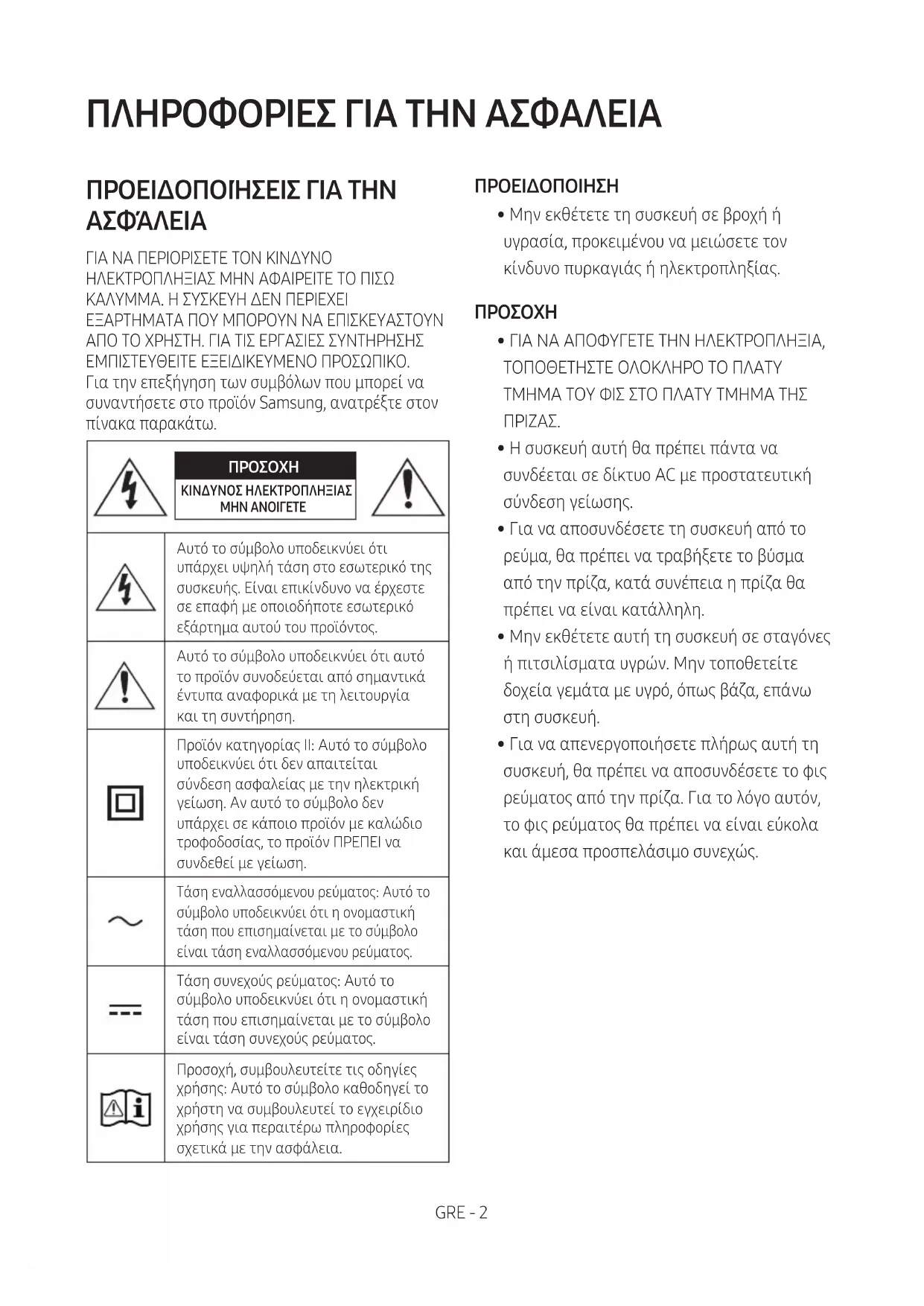 ΓΙΑ ΝΑ ΠΕΡΙΟΡΙΣΕΤΕ ΤΟΝ ΚΙΝΔΥΝΟ ΗΛΕΚΤΡΟΠΛΗΞΙΑΣ ΜΗΝ ΑΦΑΙΡΕΙΤΕ ΤΟ ΠΙΣΩ ΚΑΛΥΜΜΑ. Η ΣΥΣΚΕΥΗ ΔΕΝ ΠΕΡΙΕΧΕΙ ΕΞΑΡΤΗΜΑΤΑ ΠΟΥ ΜΠΟΡΟΥΝ ΝΑ ΕΠΙΣΚΕΥΑΣΤΟΥΝ ΑΠΟ ΤΟ ΧΡΗΣΤΗ. ΓΙΑ ΤΙΣ ΕΡΓΑΣΙΕΣ ΣΥΝΤΗΡΗΣΗΣ ΕΜΠΙΣΤΕΥΘΕΙΤΕ ΕΞΕΙΔΙΚΕΥΜΕΝΟ ΠΡΟΣΩΠΙΚΟ. Για την επεξήγηση των συμβόλων που μπορεί να συναντήσετε στο προϊόν Samsung, ανατρέξτε στον πίνακα παρακάτω.