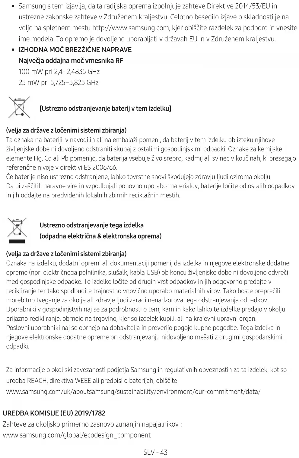 - ΊΣΧΎΣ ΕΞΌΔΟΥ ΑΣΎΡΜΑΤΗΣ ΣΥΣΚΕΥΉΣ Μέγιστη ισχύς μετάδοσης RF 100mW στα 2,4GHz – 2,4835GHz 25mW στα 5,725GHz – 5,825GHz [Σωστή απόρριψη των μπαταριών αυτού του προϊόντος] (Ίσχύει σε χώρες με ξεχωριστά συστήματα συλλογής) Αυτή η επισήμανση πάνω στη μπαταρία, το εγχειρίδιο ή τη συσκευασία υποδεικνύει ότι οι μπαταρίες αυτού του προϊόντος δεν πρέπει να απορρίπτονται μαζί με άλλα οικιακά απορρίμματα στο τέλος του κύκλου ζωής τους. Όπου υπάρχουν, τα χημικά σύμβολα Hg, Cd ή Pb υποδεικνύουν ότι η μπαταρία περιέχει υδράργυρο, κάδμιο ή μόλυβδο πάνω από τα επίπεδα αναφοράς της Ευρωπαϊκής Οδηγίας 2006/66. Αν οι μπαταρίες δεν απορριφθούν σωστά, αυτές οι ουσίες ενδέχεται να προκαλέσουν βλαβερές συνέπειες στην ανθρώπινη υγεία ή το περιβάλλον. Παρακαλούμε διαχωρίζετε τις μπαταρίες από άλλους τύπους απορριμμάτων και ανακυκλώνετέ τις μέσω του τοπικού σας, δωρεάν συστήματος ανακύκλωσης μπαταριών, για την προστασία των φυσικών πόρων και την προώθηση της επαναχρησιμοποίησης υλικών. Σωστή Απόρριψη αυτού του Προϊόντος (Απόβλητα Ηλεκτρικού & Ηλεκτρονικού Εξοπλισμού) (Ίσχύει σε χώρες με ξεχωριστά συστήματα συλλογής) Αυτό το σήμα που εμφανίζεται επάνω στο προϊόν, στα εξαρτήματά του ή στα εγχειρίδια που το συνοδεύουν, υποδεικνύει ότι το προϊόν και τα ηλεκτρονικά του εξαρτήματα (π.χ. φορτιστής, ακουστικά, καλώδιο USB) δεν θα πρέπει να ρίπτονται μαζί με τα υπόλοιπα οικιακά απορρίμματα μετά το τέλος του κύκλου ζωής τους. Προκειμένου να αποφευχθούν ενδεχόμενες βλαβερές συνέπειες στο περιβάλλον ή την υγεία εξαιτίας της ανεξέλεγκτης διάθεσης απορριμμάτων, σας παρακαλούμε να διαχωρίσετε αυτά τα προϊόντα από άλλους τύπους απορριμμάτων και να τα ανακυκλώσετε, ώστε να βοηθήσετε στην βιώσιμη επαναχρησιμοποίηση των υλικών πόρων. Οι οικιακοί χρήστες θα πρέπει να έλθουν σε επικοινωνία είτε με το κατάστημα απ’ όπου αγόρασαν αυτό το προϊόν, είτε με τις κατά τόπους υπηρεσίες, προκειμένου να πληροφορηθούν τις λεπτομέρειες σχετικά με τον τόπο και τον τρόπο με τον οποίο μπορούν να δώσουν αυτά τα προϊόντα για ασφαλή προς το περιβάλλον ανακύκλωση. Οι επιχειρήσεις-χρήστες θα πρέπει να έλθουν σε επαφή με τον προμηθευτή τους και να ελέγξουν τους όρους και τις προϋποθέσεις του συμβολαίου αγοράς. Αυτό το προϊόν και τα ηλεκτρονικά του εξαρτήματα δεν θα πρέπει να αναμιγνύονται με άλλα συνηθισμένα απορρίμματα προς διάθεση. Για πληροφορίες σχετικά με τις περιβαλλοντικές δεσμεύσεις της Samsung και τις κανονιστικές υποχρεώσεις για συγκεκριμένα προϊόντα, π.χ. REACH, WEEE και μπαταρίες, επισκεφτείτε τη διεύθυνση: www.samsung.com/uk/aboutsamsung/sustainability/environment/our-commitment/data/ ΚΑΝΟΝΊΣΜΟΣ (ΕΕ) 2019/1782 ΤΗΣ EΠΊΤΡΟΠΗΣ Απαιτήσεις οικολογικού σχεδιασμού των εξωτερικών τροφοδοτικών : www.samsung.com/global/ecodesign_componentLAT - 2