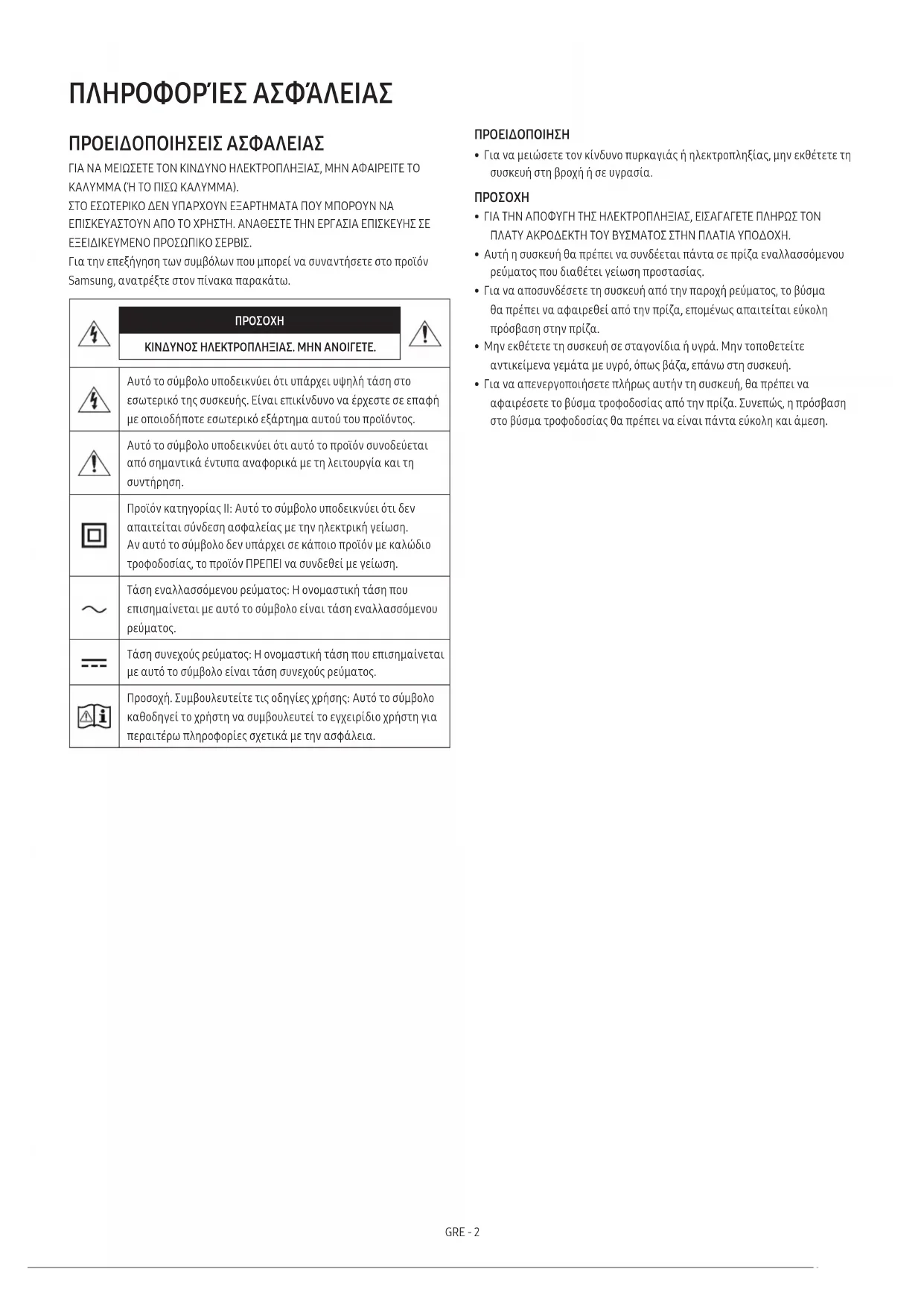 Exigences d'écoconception pour les sources d'alimentation externe : www.samsung.com/global/ecodesign_componentGRE - 2 ΠΛΗΡΟΦΟΡΊΕΣ ΑΣΦΆΛΕΙΑΣ ΠΡΟΕΙΔΟΠΟΙΗΣΕΙΣ ΑΣΦΑΛΕΙΑΣ ΓΙΑ ΝΑ ΜΕΙΩΣΕΤΕ ΤΟΝ ΚΙΝΔΥΝΟ ΗΛΕΚΤΡΟΠΛΗΞΙΑΣ, ΜΗΝ ΑΦΑΙΡΕΙΤΕ ΤΟ ΚΑΛΥΜΜΑ (Ή ΤΟ ΠΙΣΩ ΚΑΛΥΜΜΑ). ΣΤΟ ΕΣΩΤΕΡΙΚΟ ΔΕΝ ΥΠΑΡΧΟΥΝ ΕΞΑΡΤΗΜΑΤΑ ΠΟΥ ΜΠΟΡΟΥΝ ΝΑ ΕΠΙΣΚΕΥΑΣΤΟΥΝ ΑΠΟ ΤΟ ΧΡΗΣΤΗ. ΑΝΑΘΕΣΤΕ ΤΗΝ ΕΡΓΑΣΙΑ ΕΠΙΣΚΕΥΗΣ ΣΕ ΕΞΕΙΔΙΚΕΥΜΕΝΟ ΠΡΟΣΩΠΙΚΟ ΣΕΡΒΙΣ. Για την επεξήγηση των συμβόλων που μπορεί να συναντήσετε στο προϊόν Samsung, ανατρέξτε στον πίνακα παρακάτω.