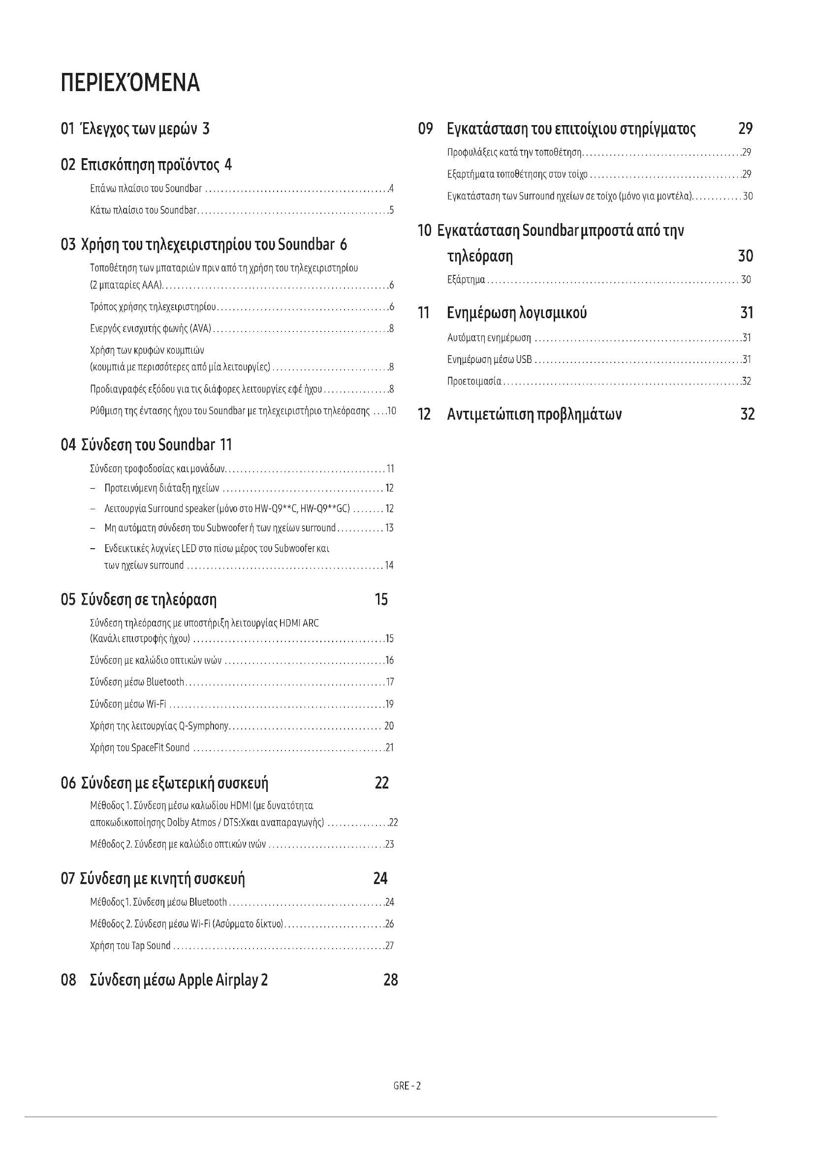 - La Soundbar est compatible avec AirPlay2 installé sur iOS 13.4 ou version ultérieure.GRE - 2 ΠΕΡΙΕΧΌΜΕΝΑ 01 Έλεγχος των μερών 3 02 Επισκόπηση προϊόντος 4 Επάνω πλαίσιο του Soundbar . . . . . . . . . . . . . . . . . . . . . . . . . . . . . . . . . . . . . . . . . . . . . . .4 Κάτω πλαίσιο του Soundbar. . . . . . . . . . . . . . . . . . . . . . . . . . . . . . . . . . . . . . . . . . . . . . . . .5 03 Χρήση του τηλεχειριστηρίου του Soundbar 6 Τοποθέτηση των μπαταριών πριν από τη χρήση του τηλεχειριστηρίου (2 μπαταρίες AAA). . . . . . . . . . . . . . . . . . . . . . . . . . . . . . . . . . . . . . . . . . . . . . . . . . . . . . . . . .6 Τρόπος χρήσης τηλεχειριστηρίου. . . . . . . . . . . . . . . . . . . . . . . . . . . . . . . . . . . . . . . . . . . .6 Ενεργός ενισχυτής φωνής (AVA) . . . . . . . . . . . . . . . . . . . . . . . . . . . . . . . . . . . . . . . . . . . . .8 Χρήση των κρυφών κουμπιών (κουμπιά με περισσότερες από μία λειτουργίες) . . . . . . . . . . . . . . . . . . . . . . . . . . . . . .8 Προδιαγραφές εξόδου για τις διάφορες λειτουργίες εφέ ήχου . . . . . . . . . . . . . . . . .8 Ρύθμιση της έντασης ήχου του Soundbar με τηλεχειριστήριο τηλεόρασης . . . .10 04 Σύνδεση του Soundbar 11 Σύνδεση τροφοδοσίας και μονάδων. . . . . . . . . . . . . . . . . . . . . . . . . . . . . . . . . . . . . . . . . 11 ‒ Προτεινόμενη διάταξη ηχείων . . . . . . . . . . . . . . . . . . . . . . . . . . . . . . . . . . . . . . . . . 12 ‒ Λειτουργία Surround speaker (μόνο στο HW-Q9**C, HW-Q9**GC) . . . . . . . . 12 ‒ Μη αυτόματη σύνδεση του Subwoofer ή των ηχείων surround . . . . . . . . . . . . 13 ‒ Ενδεικτικές λυχνίες LED στο πίσω μέρος του Subwoofer και των ηχείων surround . . . . . . . . . . . . . . . . . . . . . . . . . . . . . . . . . . . . . . . . . . . . . . . . . . 14 05 Σύνδεση σε τηλεόραση 15 Σύνδεση τηλεόρασης με υποστήριξη λειτουργίας HDMI ARC (Κανάλι επιστροφής ήχου) . . . . . . . . . . . . . . . . . . . . . . . . . . . . . . . . . . . . . . . . . . . . . . . . .15 Σύνδεση με καλώδιο οπτικών ινών . . . . . . . . . . . . . . . . . . . . . . . . . . . . . . . . . . . . . . . . .16 Σύνδεση μέσω Bluetooth. . . . . . . . . . . . . . . . . . . . . . . . . . . . . . . . . . . . . . . . . . . . . . . . . . .17 Σύνδεση μέσω Wi-Fi . . . . . . . . . . . . . . . . . . . . . . . . . . . . . . . . . . . . . . . . . . . . . . . . . . . . . . .19 Χρήση της λειτουργίας Q-Symphony. . . . . . . . . . . . . . . . . . . . . . . . . . . . . . . . . . . . . . . 20 Χρήση του SpaceFit Sound . . . . . . . . . . . . . . . . . . . . . . . . . . . . . . . . . . . . . . . . . . . . . . . . .21 06 Σύνδεση με εξωτερική συσκευή 22 Μέθοδος 1. Σύνδεση μέσω καλωδίου HDMI (με δυνατότητα αποκωδικοποίησης Dolby Atmos / DTS:Xκαι αναπαραγωγής) . . . . . . . . . . . . . . . .22 Μέθοδος 2. Σύνδεση με καλώδιο οπτικών ινών . . . . . . . . . . . . . . . . . . . . . . . . . . . . . .23 07 Σύνδεση με κινητή συσκευή 24 Μέθοδος 1. Σύνδεση μέσω Bluetooth . . . . . . . . . . . . . . . . . . . . . . . . . . . . . . . . . . . . . . . .24 Μέθοδος 2. Σύνδεση μέσω Wi-Fi (Ασύρματο δίκτυο). . . . . . . . . . . . . . . . . . . . . . . . . .26 Χρήση του Tap Sound . . . . . . . . . . . . . . . . . . . . . . . . . . . . . . . . . . . . . . . . . . . . . . . . . . . . . .27 08 Σύνδεση μέσω Apple Airplay 2 28 09 Εγκατάσταση του επιτοίχιου στηρίγματος 29 Προφυλάξεις κατά την τοποθέτηση. . . . . . . . . . . . . . . . . . . . . . . . . . . . . . . . . . . . . . . . .29 Εξαρτήματα τοποθέτησης στον τοίχο . . . . . . . . . . . . . . . . . . . . . . . . . . . . . . . . . . . . . . .29 Εγκατάσταση των Surround ηχείων σε τοίχο (μόνο για μοντέλα). . . . . . . . . . . . . 30 10 Εγκατάσταση Soundbar μπροστά από την τηλεόραση 30 Εξάρτημα . . . . . . . . . . . . . . . . . . . . . . . . . . . . . . . . . . . . . . . . . . . . . . . . . . . . . . . . . . . . . . . . 30 11 Ενημέρωση λογισμικού 31 Αυτόματη ενημέρωση . . . . . . . . . . . . . . . . . . . . . . . . . . . . . . . . . . . . . . . . . . . . . . . . . . . . .31 Ενημέρωση μέσω USB . . . . . . . . . . . . . . . . . . . . . . . . . . . . . . . . . . . . . . . . . . . . . . . . . . . . .31 Προετοιμασία . . . . . . . . . . . . . . . . . . . . . . . . . . . . . . . . . . . . . . . . . . . . . . . . . . . . . . . . . . . . .32 12 Αντιμετώπιση προβλημάτων 32GRE - 3 01 ΈΛΕΓΧΟΣ ΤΩΝ ΜΕΡΏΝ SOUNDBAR Κύρια μονάδα του Soundbar Τηλεχειριστήριο / Μπαταρίες του Soundbar Subwoofer POWER x 2 x 4 ή 2 Ηχείο surround (προαιρετικό) (Αριστερό / Δεξί) Καλώδιο τροφοδοσίας (Subwoofer, ηχείο surround, Soundbar) (προαιρετικό) Καλώδιο HDMI x 2 x 2 (M4 x L10) Οδηγός επιτοίχιας στήριξης Βίδα στήριξης Βίδα x 2 x 4 Βραχίον
