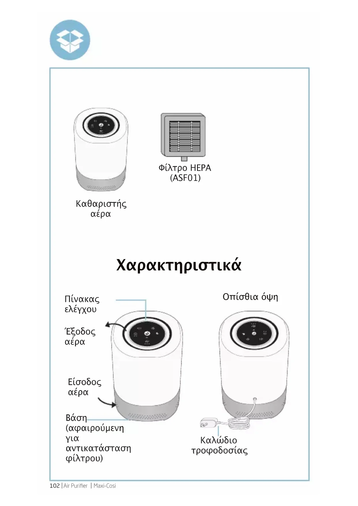 Επαναφορά χρονοδιακόπτη φίλτρου : Μόλις αντικαταστήσετε το φίλτρο, πρέπει να επαναφέρετε το χρονοδιακόπτη αντικατάστασης φίλτρου. Πιέστε παρατεταμένα το κουμπί ανεμιστήρα για 5 δευτερόλεπτα. Ένας ήχος θα σας ενημερώσει ότι η επαναφορά είναι επιτυχής και το σήμα θα σταματήσει να αναβοσβήνει. ΣΗΜΕΙΩΣΗ:Η λυχνία ανεμιστήρα θα αλλάξει σε κόκκινη αν δεν επαναφέρετε τον χρονοδιακόπτη. Υπενθύμιση αντικατάστασης φίλτρου : Όταν ο αθροιστικός χρόνος χρήσης του φίλτρου φτάσει τις 1.000 ώρες, το εικονίδιο ανεμιστήρα γίνεται κόκκινο. ΣΗΜΕΙΩΣΗ: Ο χρόνος αντικατάστασης του φίλτρου βασίζεται στη χρήση. 1.000 ώρες αντιστοιχούν σε περίπου 90 ημέρες με καθημερινή χρήση 11 ωρών.24 ώρες συνεχούς χρήσης θα απαιτούσαν αλλαγή φίλτρου νωρίτερα.Maxi-Cosi