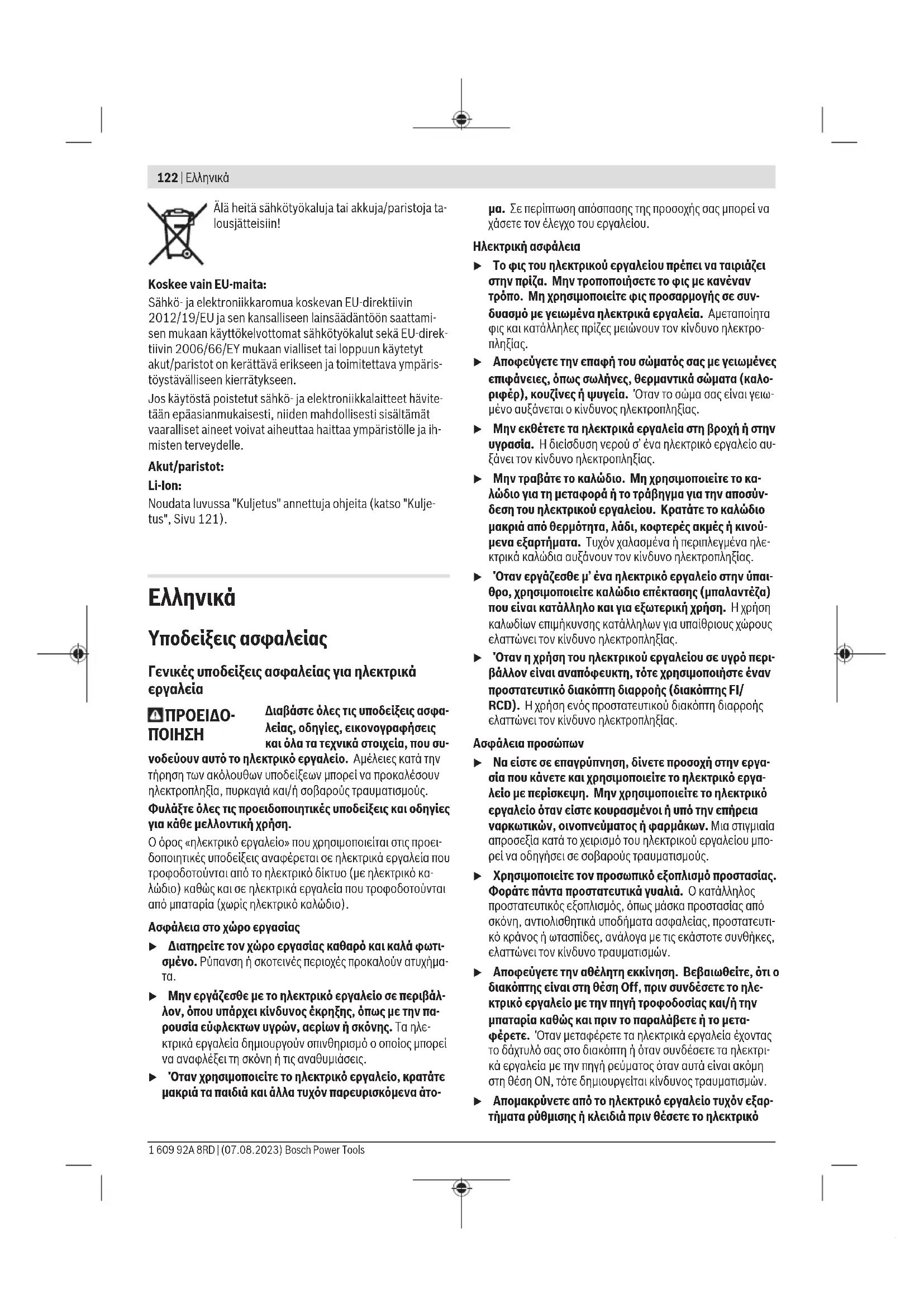 u Αποφεύγετε την επαφή του σώματός σας με γειωμένες επιφάνειες, όπως σωλήνες, θερμαντικά σώματα (καλο- ριφέρ), κουζίνες ή ψυγεία. Όταν το σώμα σας είναι γειω- μένο αυξάνεται ο κίνδυνος ηλεκτροπληξίας. u Μην εκθέτετε τα ηλεκτρικά εργαλεία στη βροχή ή στην υγρασία. Η διείσδυση νερού σ’ ένα ηλεκτρικό εργαλείο αυ- ξάνει τον κίνδυνο ηλεκτροπληξίας. u Μην τραβάτε το καλώδιο. Μη χρησιμοποιείτε το κα- λώδιο για τη μεταφορά ή το τράβηγμα για την αποσύν- δεση του ηλεκτρικού εργαλείου. Κρατάτε το καλώδιο μακριά από θερμότητα, λάδι, κοφτερές ακμές ή κινού- μενα εξαρτήματα. Τυχόν χαλασμένα ή περιπλεγμένα ηλε- κτρικά καλώδια αυξάνουν τον κίνδυνο ηλεκτροπληξίας. u Όταν εργάζεσθε μ’ ένα ηλεκτρικό εργαλείο στην ύπαι- θρο, χρησιμοποιείτε καλώδιο επέκτασης (μπαλαντέζα) που είναι κατάλληλο και για εξωτερική χρήση. Ηχρήση καλωδίων επιμήκυνσης κατάλληλων για υπαίθριους χώρους ελαττώνει τον κίνδυνο ηλεκτροπληξίας. u Όταν η χρήση του ηλεκτρικού εργαλείου σε υγρό περι- βάλλον είναι αναπόφευκτη, τότε χρησιμοποιήστε έναν προστατευτικό διακόπτη διαρροής (διακόπτηςFI/ RCD). Ηχρήση ενός προστατευτικού διακόπτη διαρροής ελαττώνει τον κίνδυνο ηλεκτροπληξίας. Ασφάλεια προσώπων u Να είστε σε επαγρύπνηση, δίνετε προσοχή στην εργα- σία που κάνετε και χρησιμοποιείτε το ηλεκτρικό εργα- λείο με περίσκεψη. Μην χρησιμοποιείτε το ηλεκτρικό εργαλείο όταν είστε κουρασμένοι ή υπό την επήρεια ναρκωτικών, οινοπνεύματος ή φαρμάκων. Μια στιγμιαία απροσεξία κατά το χειρισμό του ηλεκτρικού εργαλείου μπο- ρεί να οδηγήσει σε σοβαρούς τραυματισμούς. u Χρησιμοποιείτε τον προσωπικό εξοπλισμό προστασίας. Φοράτε πάντα προστατευτικά γυαλιά. Ο κατάλληλος προστατευτικός εξοπλισμός, όπως μάσκα προστασίας από σκόνη, αντιολισθητικά υποδήματα ασφαλείας, προστατευτι- κό κράνος ή ωτασπίδες, ανάλογα με τις εκάστοτε συνθήκες, ελαττώνει τον κίνδυνο τραυματισμών. u Αποφεύγετε την αθέλητη εκκίνηση. Βεβαιωθείτε, ότι ο διακόπτης είναι στη θέση Off, πριν συνδέσετε το ηλε- κτρικό εργαλείο με την πηγή τροφοδοσίας και/ή την μπαταρία καθώς και πριν το παραλάβετε ή το μετα- φέρετε. Όταν μεταφέρετε τα ηλεκτρικά εργαλεία έχοντας το δάχτυλό σας στο διακόπτη ή όταν συνδέσετε τα ηλεκτρι- κά εργαλεία με την πηγή ρεύματος όταν αυτά είναι ακόμη στη θέση ΟΝ, τότε δημιουργείται κίνδυνος τραυματισμών. u Απομακρύνετε από το ηλεκτρικό εργαλείο τυχόν εξαρ- τήματα ρύθμισης ή κλειδιά πριν θέσετε το ηλεκτρικό 1 609 92A 8RD | (07.08.2023) Bosch Power ToolsΕλληνικά | 123 εργαλείο σε λειτουργία. Ένα εργαλείο ή κλειδί συναρμο- λογημένο σ’ ένα περιστρεφόμενο τμήμα ενός ηλεκτρικού εργαλείου μπορεί να οδηγήσει σε τραυματισμούς. u Προσέχετε πως στέκεστε. Φροντίζετε για την ασφαλή στάση του σώματός σας και διατηρείτε πάντοτε την ισο- ρροπία σας. Έτσι μπορείτε να ελέγξετε καλύτερα το ηλε- κτρικό εργαλείο σε περιπτώσεις απροσδόκητων περιστάσε-
