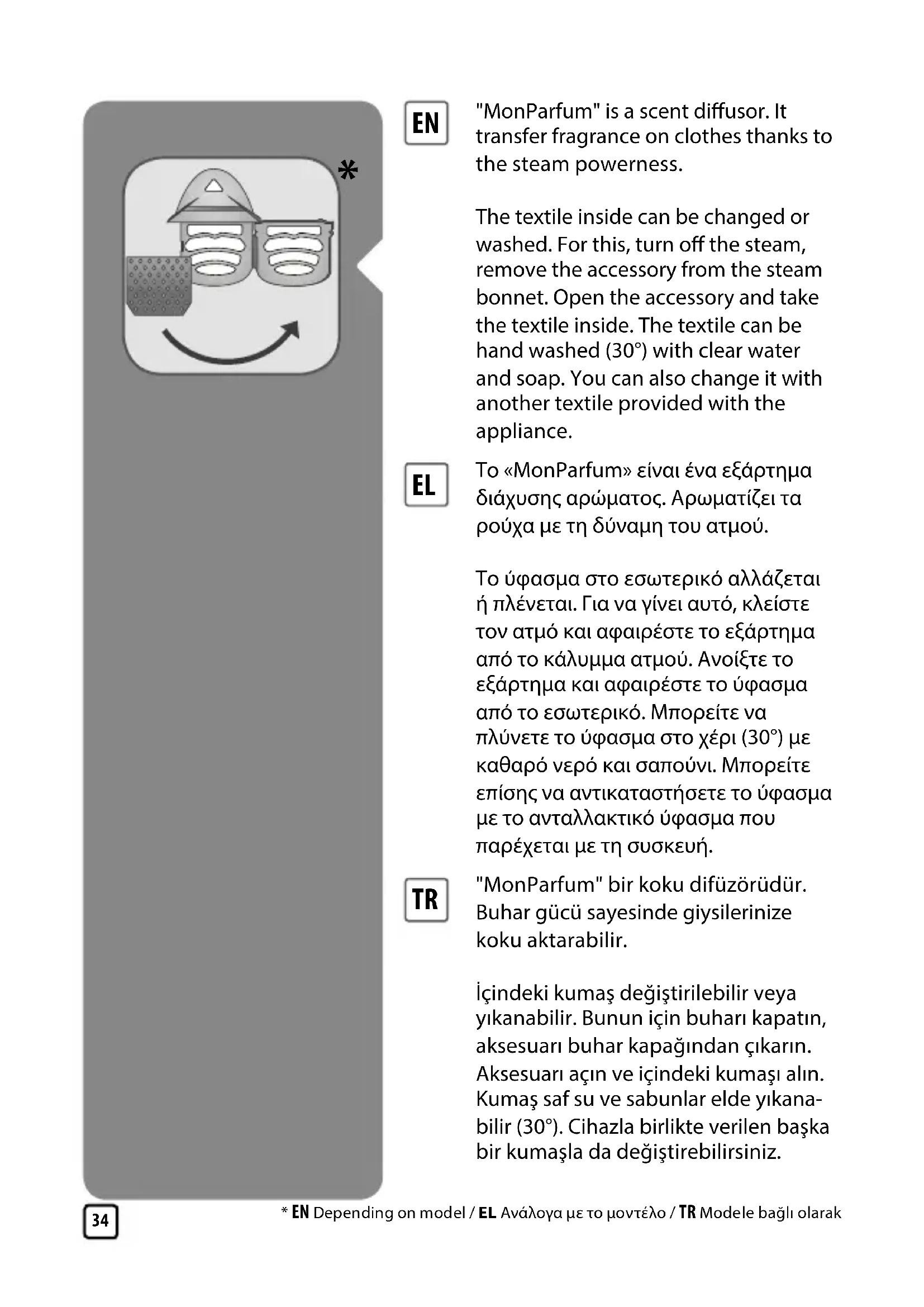 Το «MonParfum» είναι ένα εξάρτημα διάχυσης αρώματος. Αρωματίζει τα ρούχα με τη δύναμη του ατμού. Το ύφασμα στο εσωτερικό αλλάζεται ή πλένεται. Για να γίνει αυτό, κλείστε τον ατμό και αφαιρέστε το εξάρτημα από το κάλυμμα ατμού. Ανοίξτε το εξάρτημα και αφαιρέστε το ύφασμα από το εσωτερικό. Μπορείτε να πλύνετε το ύφασμα στο χέρι (30°) με καθαρό νερό και σαπούνι. Μπορείτε επίσης να αντικαταστήσετε το ύφασμα με το ανταλλακτικό ύφασμα που παρέχεται με τη συσκευή.