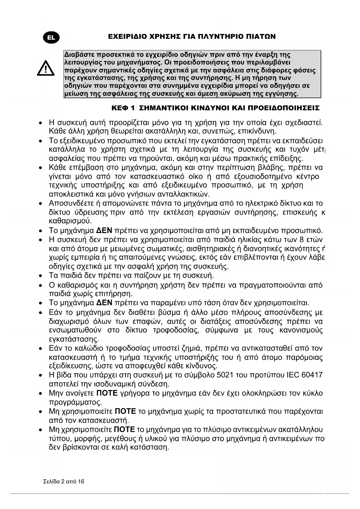 Διαβάστε προσεκτικά το εγχειρίδιο οδηγιών πριν από την έναρξη της λειτουργίας του μηχανήματος. Οι προειδοποιήσεις που περιλαμβάνει παρέχουν σημαντικές οδηγίες σχετικά με την ασφάλεια στις διάφορες φάσεις της εγκατάστασης, της χρήσης και της συντήρησης. Η μη τήρηση των οδηγιών που παρέχονται στα συνημμένα εγχειρίδια μπορεί να οδηγήσει σε μείωση της ασφάλειας της συσκευής και άμεση ακύρωση της εγγύησης. ΚΕΦ 1 ΣΗΜΑΝΤΙΚΟΙ ΚΙΝΔΥΝΟΙ ΚΑΙ ΠΡΟΕΙΔΟΠΟΙΗΣΕΙΣ Η συσκευή αυτή προορίζεται μόνο για τη χρήση για την οποία έχει σχεδιαστεί. Κάθε άλλη χρήση θεωρείται ακατάλληλη και, συνεπώς, επικίνδυνη. Το εξειδικευμένο προσωπικό που εκτελεί την εγκατάσταση πρέπει να εκπαιδεύσει κατάλληλα το χρήστη σχετικά με τη λειτουργία της συσκευής και τυχόν μέτρα ασφαλείας που πρέπει να τηρούνται, ακόμη και μέσω πρακτικής επίδειξης. Κάθε επέμβαση στο μηχάνημα, ακόμη και στην περίπτωση βλάβης, πρέπει να γίνεται μόνο από τον κατασκευαστικό οίκο ή από εξουσιοδοτημένο κέντρο τεχνικής υποστήριξης και από εξειδικευμένο προσωπικό, με τη χρήση αποκλειστικά και μόνο γνήσιων ανταλλακτικών. Αποσυνδέετε ή απομονώνετε πάντα το μηχάνημα από το ηλεκτρικό δίκτυο και το δίκτυο ύδρευσης πριν από την εκτέλεση εργασιών συντήρησης, επισκευής και καθαρισμού. Το μηχάνημα ΔΕΝ πρέπει να χρησιμοποιείται από μη εκπαιδευμένο προσωπικό. Η συσκευή δεν πρέπει να χρησιμοποιείται από παιδιά ηλικίας κάτω των 8 ετών και από άτομα με μειωμένες σωματικές, αισθητηριακές ή διανοητικές ικανότητες ή χωρίς εμπειρία ή τις απαιτούμενες γνώσεις, εκτός εάν επιβλέπονται ή έχουν λάβει οδηγίες σχετικά με την ασφαλή χρήση της συσκευής. Τα παιδιά δεν πρέπει να παίζουν με τη συσκευή. Ο καθαρισμός και η συντήρηση χρήστη δεν πρέπει να πραγματοποιούνται από παιδιά χωρίς επιτήρηση. Το μηχάνημα ΔΕΝ πρέπει να παραμένει υπό τάση όταν δεν χρησιμοποιείται. Εάν το μηχάνημα δεν διαθέτει βύσμα ή άλλο μέσο πλήρους αποσύνδεσης με διαχωρισμό όλων των επαφών, αυτές οι διατάξεις αποσύνδεσης πρέπει να ενσωματωθούν στο δίκτυο τροφοδοσίας, σύμφωνα με τους κανονισμούς εγκατάστασης. Εάν το καλώδιο τροφοδοσίας υποστεί ζημιά, πρέπει να αντικατασταθεί από τον κατασκευαστή ή το τμήμα τεχνικής υποστήριξής του ή από άτομο παρόμοιας εξειδίκευσης, ώστε να αποφευχθεί κάθε κίνδυνος. Η βίδα που υπάρχει στη συσκευή με το σύμβολο 5021 του προτύπου IEC 60417 αποτελεί την ισοδυναμική σύνδεση. Μην ανοίγετε ΠΟΤΕ γρήγορα το μηχάνημα εάν δεν έχει ολοκληρώσει τον κύκλο προγράμματος. Μη χρησιμοποιείτε ΠΟΤΕ το μηχάνημα χωρίς τα προστατευτικά που παρέχονται από τον κατασκευαστή. Μη χρησιμοποιείτε ΠΟΤΕ το μηχάνημα για το πλύσιμο αντικειμένων ακατάλληλου τύπου, μορφής, μεγέθους ή υλικού για πλύσιμο στο μηχάνημα ή αντικειμένων που δεν βρίσκονται σε καλή κατάσταση.ΕΧΕΙΡΙΔΙΟ ΧΡΗΣΗΣ ΓΙΑ ΠΛΥΝΤΗΡΙΟ ΠΙΑΤΩΝ Σελίδα 3 από 16