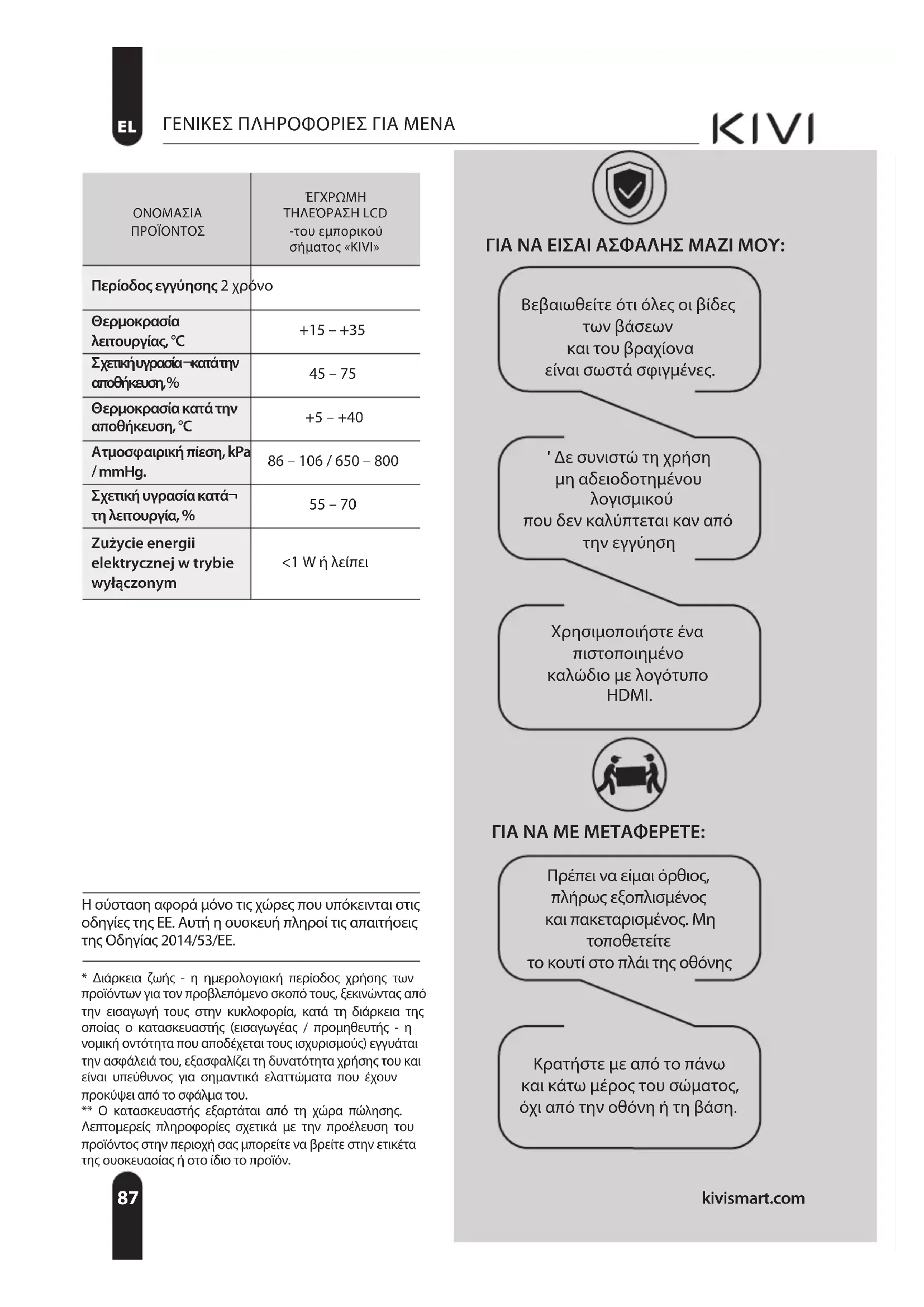 ΤΗΛΕΌΡΑΣΗ LCD -του εμπορικού σήματος «KIVI» Περίοδος εγγύησης 2 χρόνο Θερμοκρασία λειτουργίας, °C +15 – +35 Σχετική υγρασία ¬κατά την αποθήκευση, % 45 – 75 Θερμοκρασία κατά την αποθήκευση, °C +5 – +40 Ατμοσφαιρική πίεση, kPa / mmHg. 86 – 106 / 650 – 800 Σχετική υγρασία κατά¬ τη λειτουργία, % 55 – 70 Zużycie energii elektrycznej w trybie wyłączonym <1 W ή λείπειΓΙΑ ΝΑ ΜΗΝ ΜΠΟΡΟΥΝ ΠΛΕΟΝ ΝΑ ΜΕ ΧΡΗΣΙΜΟΠΟΙΟΥΝ: