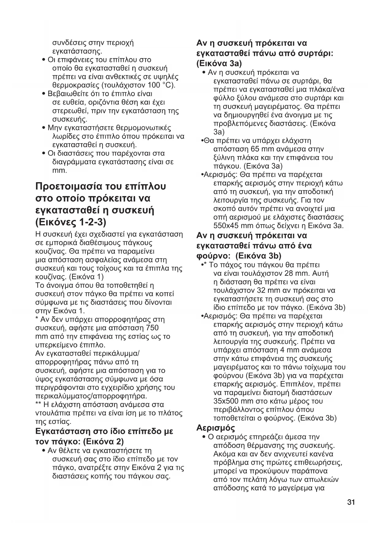 - Οι επιφάνειες του επίπλου στο οποίο θα εγκατασταθεί η συσκευή πρέπει να είναι ανθεκτικές σε υψηλές θερμοκρασίες (τουλάχιστον 100 °C).