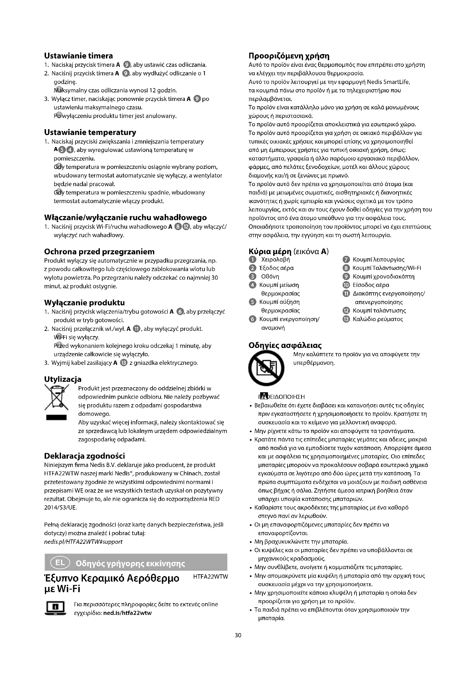 για να ενεργοποιήσετε τη λειτουργία αναμονής.2. Πατήστε το κουμπί ενεργοποίηση/απενεργοποίηση A για να απενεργοποιήσετε το προϊόν. Το Wi-Fi απενεργοποιείται. Περιμένετε 1 λεπτό προτού συνεχίσετε με το επόμενο βήμα για να επιτρέψετε στο προϊόν να απενεργοποιηθεί πλήρως.3. Αποσυνδέστε το καλώδιο ρεύματος A από το ρεύμα. Tο προϊόν προορίζεται για ξεχωριστή συλλογή σε κατάλληλο σημείο συλλογής. Μην απορρίπτετε το προϊόν μαζί με τα οικιακά απόβλητα.Για περισσότερες πληροφορίες επικοινωνήστε με τον αντιπρόσωπό σας ή τις τοπικές αρχές διαχείρισης αποβλήτων. Δήλωση συμμόρφωσης Εμείς, η Nedis B.V. δηλώνουμε ως κατασκευαστής ότι το προϊόν HTFA22WTW από τη μάρκα μας Nedis®, το οποίο κατασκευάζεται στην Κίνα, έχει ελεγχθεί σύμφωνα με όλα τα σχετικά πρότυπα και κανονισμούς της ΕΚ και ότι όλοι οι έλεγχοι έχει ολοκληρωθεί με επιτυχία. Η δήλωση συμμόρφωσης περιλαμβάνει αλλά δεν περιορίζεται στον κανονισμό RED 2014/53/EU.33