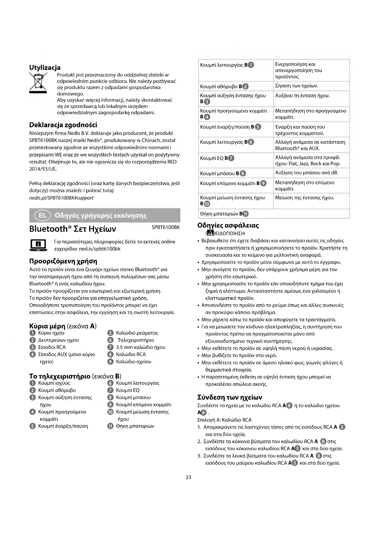 και στα δύο ηχεία.2. Συνδέστε τα κόκκινα βύσματα του καλωδίου RCA A στις εισόδους του κόκκινου καλωδίου RCA A και στα δύο ηχεία.3. Συνδέστε τα λευκά βύσματα του καλωδίου RCA A στις εισόδους του μαύρου καλωδίου RCA A και στα δύο ηχεία. Utylizacja Produkt jest przeznaczony do oddzielnej zbiórki w odpowiednim punkcie odbioru. Nie należy pozbywać się produktu razem z odpadami gospodarstwa domowego.Aby uzyskać więcej informacji, należy skontaktować się ze sprzedawcą lub lokalnym urzędem odpowiedzialnym zagospodarkę odpadami. Deklaracja zgodności Niniejszym rma Nedis B.V. deklaruje jako producent, że produkt SPBT6100BK naszej marki Nedis®, produkowany w Chinach, został przetestowany zgodnie ze wszystkimi odpowiednimi normami i przepisami WE oraz że we wszystkich testach uzyskał on pozytywny rezultat. Obejmuje to, ale nie ogranicza się do rozporządzenia RED 2014/53/UE.Pełną deklarację zgodności (oraz kartę danych bezpieczeństwa, jeśli dotyczy) można znaleźć i pobrać tutaj:nedis.pl/SPBT6100BK#support