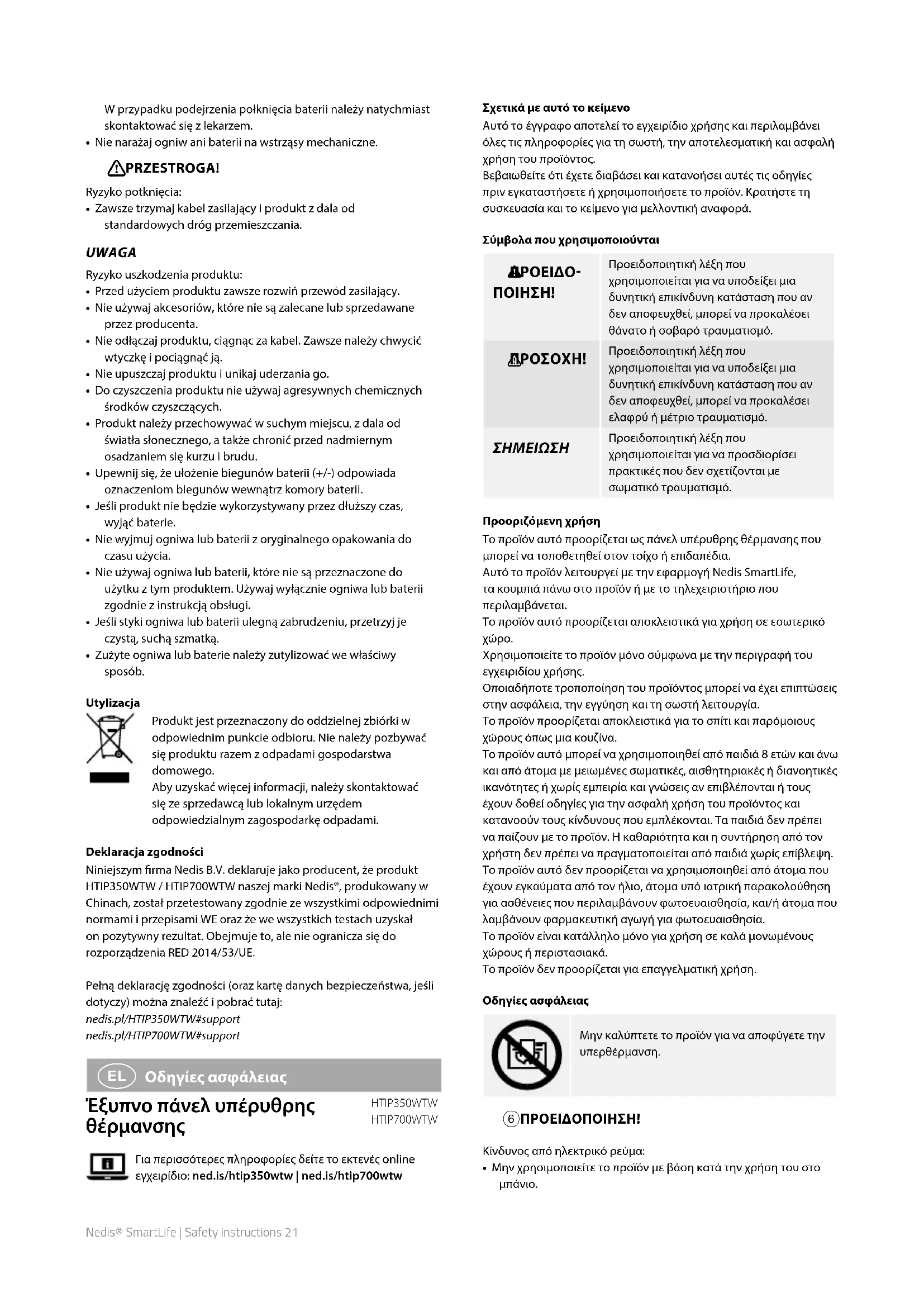 Δήλωση συμμόρφωσης Εμείς, η Nedis B.V. δηλώνουμε ως κατασκευαστής ότι το προϊόν HTIP350WTW / HTIP700WTW από τη μάρκα μας Nedis®, το οποίο κατασκευάζεται στην Κίνα, έχει ελεγχθεί σύμφωνα με όλα τα σχετικά πρότυπα και κανονισμούς της ΕΚ και ότι όλοι οι έλεγχοι έχει ολοκληρωθεί με επιτυχία. Η δήλωση συμμόρφωσης περιλαμβάνει αλλά δεν περιορίζεται στον κανονισμό RED 2014/53/EU. Το πλήρες κείμενο της δήλωσης συμμόρφωσης (και το δελτίο ασφάλεια όπου ισχύει) υπάρχει και είναι διαθέσιμο προς λήψη στο: nedis.gr/HTIP350WTW#support nedis.gr/HTIP700WTW#support