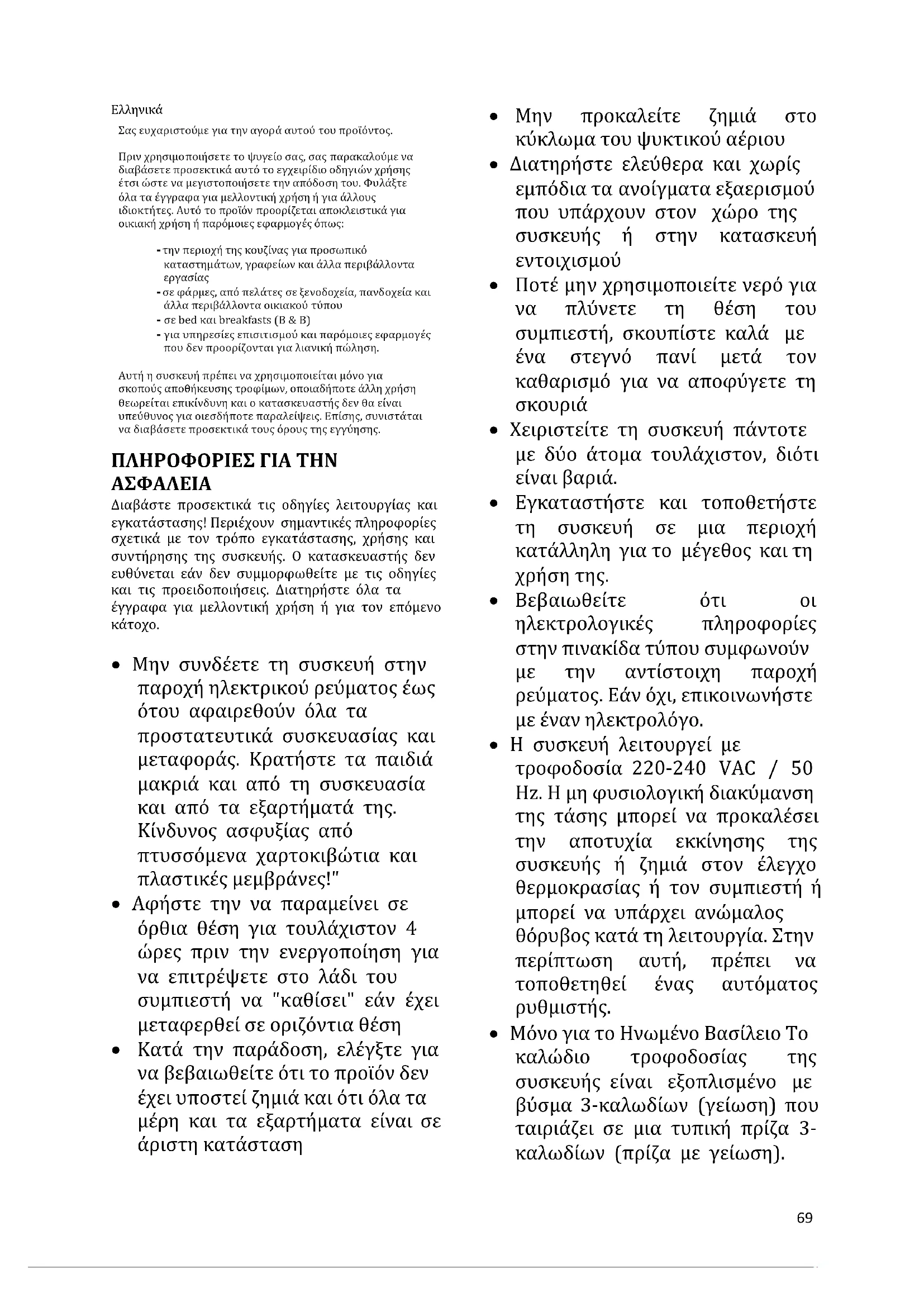 - Εάν η συσκευή παραμείνει ανοικτή για μεγάλο χρονικό διάστημα, σβήστε την, ξεπαγώστε την, καθαρίστε την, στεγνώστε την και αφήστε την πόρτα ανοικτή για να αποφύγετε την73 ανάπτυξη μούχλας μέσα στη