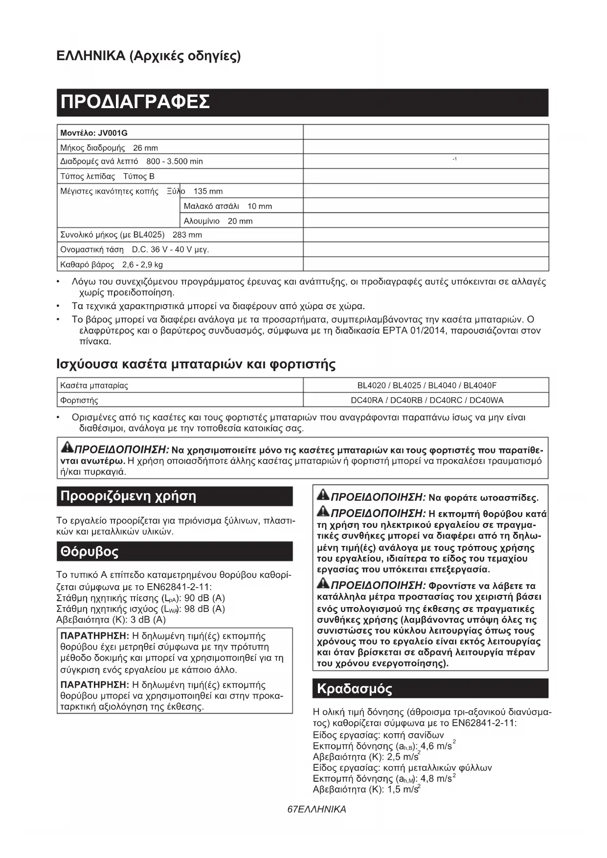 - Ορισμένεςαπότιςκασέτεςκαιτουςφορτιστέςμπαταριώνπουαναγράφονταιπαραπάνωίσωςναμηνείναι διαθέσιμοι,ανάλογαμετηντοποθεσίακατοικίαςσας. ΠΡΟΕΙΔΟΠΟΙΗΣΗ: Να χρησιμοποιείτε μόνο τις κασέτες μπαταριών και τους φορτιστές που παρατίθε- νται ανωτέρω.Ηχρήσηοποιασδήποτεάλληςκασέταςμπαταριώνήφορτιστήμπορείναπροκαλέσειτραυματισμό ή/καιπυρκαγιά. Προοριζόμενη χρήση Τοεργαλείοπροορίζεταιγιαπριόνισμαξύλινων,πλαστι- κώνκαιμεταλλικώνυλικών.