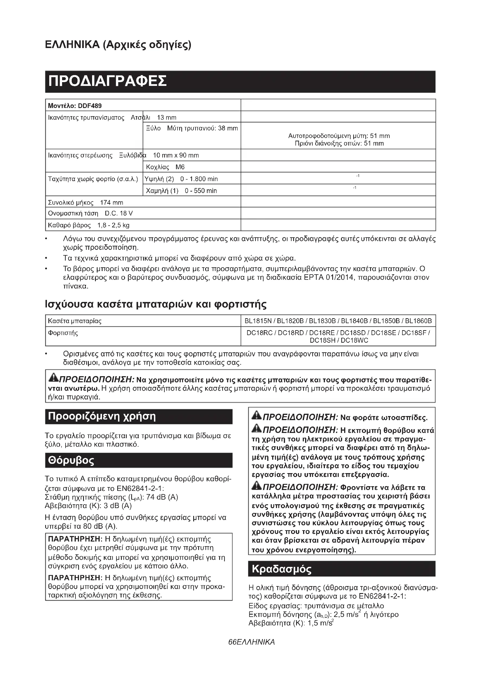- Original Makita-akku og oplader BEMÆRK: Nogle ting på denne liste kan være inklu- deretiværktøjspakkensomstandardtilbehør.Detkan være forskellige fra land til land.66 ΕΛΛΗΝΙΚΑ ΕΛΛΗΝΙΚΑ (Αρχικές οδηγίες) ΠΡΟΔΙΑΓΡΑΦΕΣ Μοντέλο: DDF489 Ικανότητεςτρυπανίσματος Ατσάλι 13 mm Ξύλο Μύτητρυπανιού:38mm Αυτοτροφοδοτούμενημύτη:51mm Πριόνιδιάνοιξηςοπών:51mm Ικανότητεςστερέωσης Ξυλόβιδα 10 mm x 90 mm Κοχλίας M6 Ταχύτηταχωρίςφορτίο(σ.α.λ.) Υψηλή(2) 0 - 1.800 min
