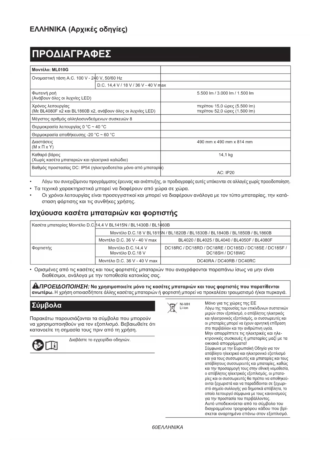 Χρόνος λειτουργίας (Με BL4080F x2 και BL1860B x2, ανάβουν όλες οι λυχνίες LED) περίπου 15,0 ώρες (5.500 lm) περίπου 52,0 ώρες (1.500 lm) Μέγιστος αριθμός αλληλοσυνδεόμενων συσκευών 8 Θερμοκρασία λειτουργίας 0 °C ~ 40 °C Θερμοκρασία αποθήκευσης -20 °C ~ 60 °C