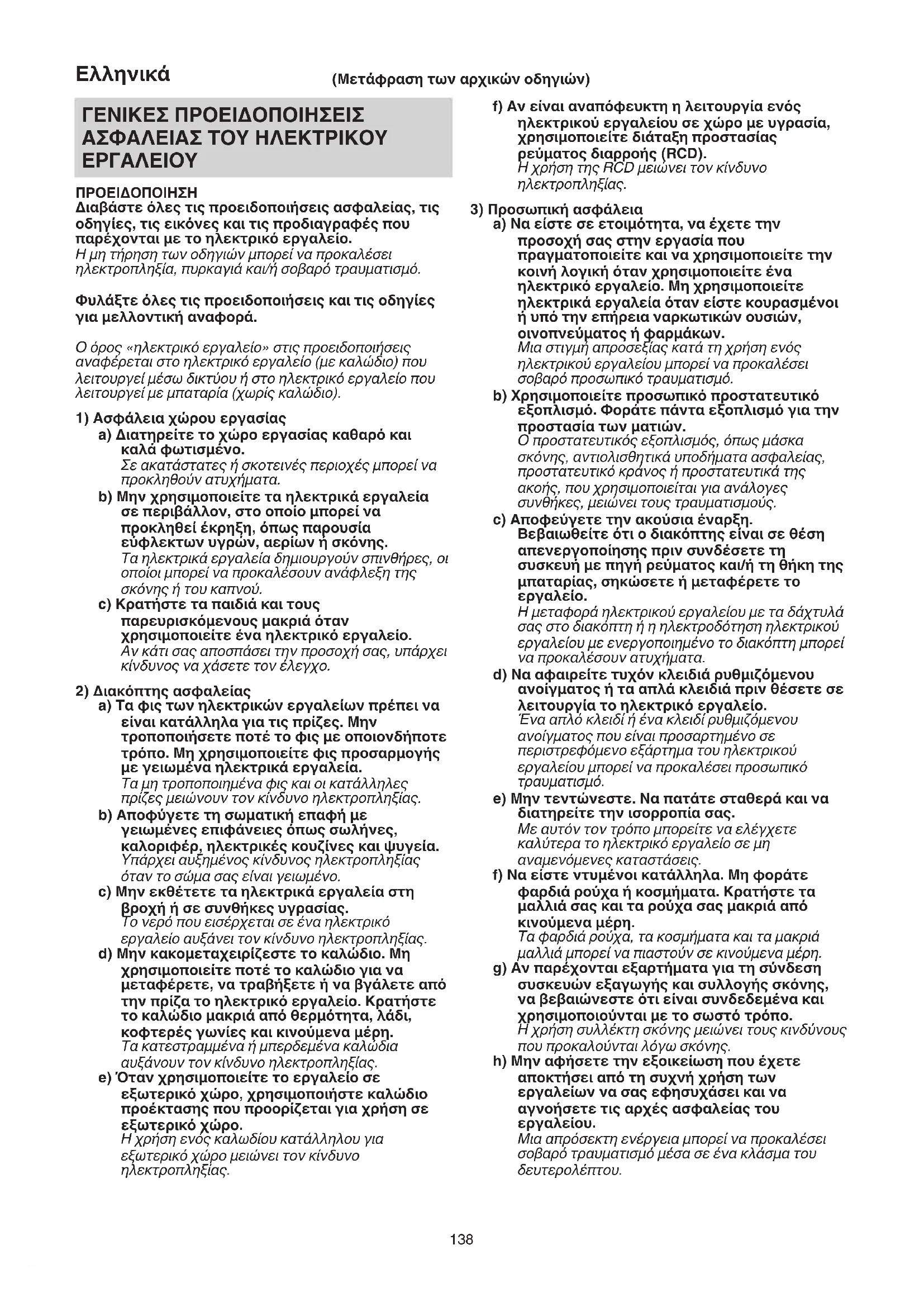 ΠΡΟΕΙΔΟΠΟΙΗΣΗ Διαβάστε όλες τις προειδοποιήσεις ασφαλείας, τις οδηγίες, τις εικόνες και τις προδιαγραφές που παρέχονται με το ηλεκτρικό εργαλείο. Η μη τήρηση των οδηγιών μπορεί να προκαλέσει ηλεκτροπληξία, πυρκαγιά και/ή σοβαρό τραυματισμό. Φυλάξτε όλες τις προειδοποιήσεις και τις οδηγίες για μελλοντική αναφορά. Ο όρος «ηλεκτρικό εργαλείο» στις προειδοποιήσεις αναφέρεται στο ηλεκτρικό εργαλείο (με καλώδιο) που λειτουργεί μέσω δικτύου ή στο ηλεκτρικό εργαλείο που λειτουργεί με μπαταρία (χωρίς καλώδιο).