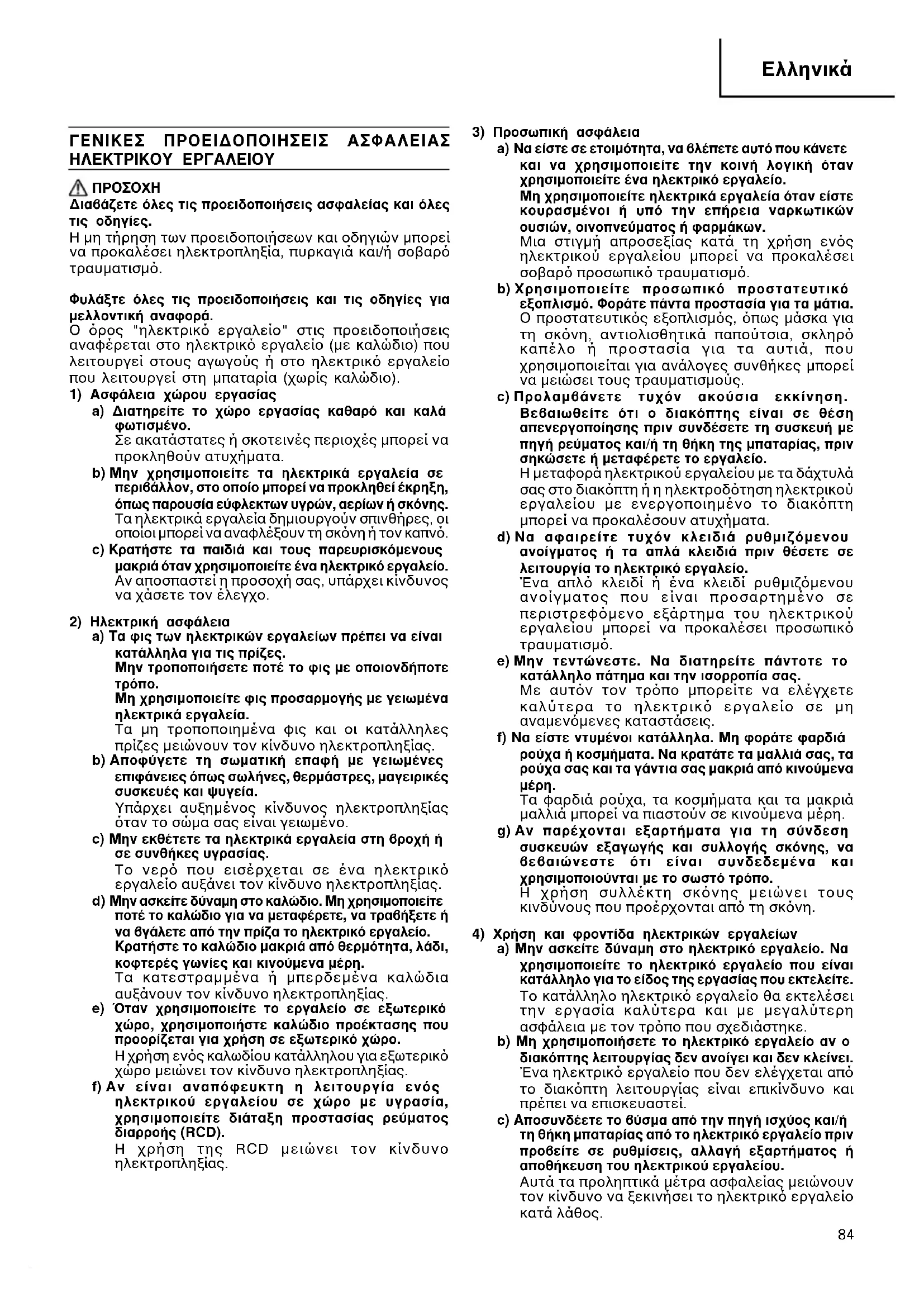 a) ∆· ÊȘ ÙˆÓ ËÏÂÎÙÚÈÎÒÓ ÂÚÁ·Ï›ˆÓ Ú¤ÂÈ Ó· Â›Ó·È Î·Ù¿ÏÏËÏ· ÁÈ· ÙȘ Ú›˙˜. ªËÓ ÙÚÔÔÔÈ‹ÛÂÙ ÔÙ¤ ÙÔ ÊȘ Ì ÔÔÈÔÓ‰‹ÔÙ ÙÚfiÔ. ªË ¯ÚËÛÈÌÔÔț٠ÊȘ ÚÔÛ·ÚÌÔÁ‹˜ Ì ÁÂȈ̤ӷ ËÏÂÎÙÚÈο ÂÚÁ·Ï›·. Τα µη τροποποιηµένα φις και οι κατάλληλες πρίζες µειώνουν τον κίνδυνο ηλεκτροπληξίας. b) ∞ÔʇÁÂÙ ÙË ÛˆÌ·ÙÈ΋ ·ʋ Ì ÁÂȈ̤Ó˜ ÂÈÊ¿ÓÂȘ fiˆ˜ ۈϋÓ˜, ıÂÚÌ¿ÛÙÚ˜, Ì·ÁÂÈÚÈΤ˜ Û˘Û΢¤˜ Î·È „˘Á›·. Υπάρχει αυξηµένος κίνδυνος ηλεκτροπληξίας ταν το σώµα σας είναι γειωµένο. c) ªËÓ ÂÎı¤ÙÂÙ ٷ ËÏÂÎÙÚÈο ÂÚÁ·Ï›· ÛÙË ‚ÚÔ¯‹ ‹ ÛÂ Û˘Óı‹Î˜ ˘ÁÚ·Û›·˜. Το νερ που εισέρχεται σε ένα ηλεκτρικ εργαλείο αυξάνει τον κίνδυνο ηλεκτροπληξίας. d) ªËÓ ·ÛΛ٠‰‡Ó·ÌË ÛÙÔ Î·ÏÒ‰ÈÔ. ªË ¯ÚËÛÈÌÔÔț٠ÔÙ¤ ÙÔ Î·ÏÒ‰ÈÔ ÁÈ· Ó· ÌÂٷʤÚÂÙÂ, Ó· ÙÚ·‚‹ÍÂÙ ‹ Ó· ‚Á¿ÏÂÙ ·fi ÙËÓ Ú›˙· ÙÔ ËÏÂÎÙÚÈÎfi ÂÚÁ·Ï›Ô. ∫Ú·Ù‹ÛÙ ÙÔ Î·ÏÒ‰ÈÔ Ì·ÎÚÈ¿ ·fi ıÂÚÌfiÙËÙ·, Ï¿‰È, ÎÔÊÙÂÚ¤˜ ÁˆÓ›Â˜ Î·È ÎÈÓÔ‡ÌÂÓ· ̤ÚË. Τα κατεστραµµένα ή µπερδεµένα καλώδια αυξάνουν τον κίνδυνο ηλεκτροπληξίας. e) ŸÙ·Ó ¯ÚËÛÈÌÔÔț٠ÙÔ ÂÚÁ·ÏÂ›Ô Û Â͈ÙÂÚÈÎfi ¯ÒÚÔ, ¯ÚËÛÈÌÔÔÈ‹ÛÙ ηÏÒ‰ÈÔ ÚÔ¤ÎÙ·Û˘ Ô˘ ÚÔÔÚ›˙ÂÙ·È ÁÈ· ¯Ú‹ÛË Û Â͈ÙÂÚÈÎfi ¯ÒÚÔ. Η χρήση ενς καλωδίου κατάλληλου για εξωτερικ χώρο µειώνει τον κίνδυνο ηλεκτροπληξίας. f) ∞Ó Â›Ó·È ·Ó·fiÊ¢ÎÙË Ë ÏÂÈÙÔ˘ÚÁ›· ÂÓfi˜ ËÏÂÎÙÚÈÎÔ‡ ÂÚÁ·Ï›Ԣ Û ¯ÒÚÔ Ì ˘ÁÚ·Û›·, ¯ÚËÛÈÌÔÔț٠‰È¿Ù·ÍË ÚÔÛÙ·Û›·˜ Ú‡̷ÙÔ˜ ‰È·ÚÚÔ‹˜ (RCD). Η χρήση της RCD µειώνει τον κίνδυνο ηλεκτροπληξίας.