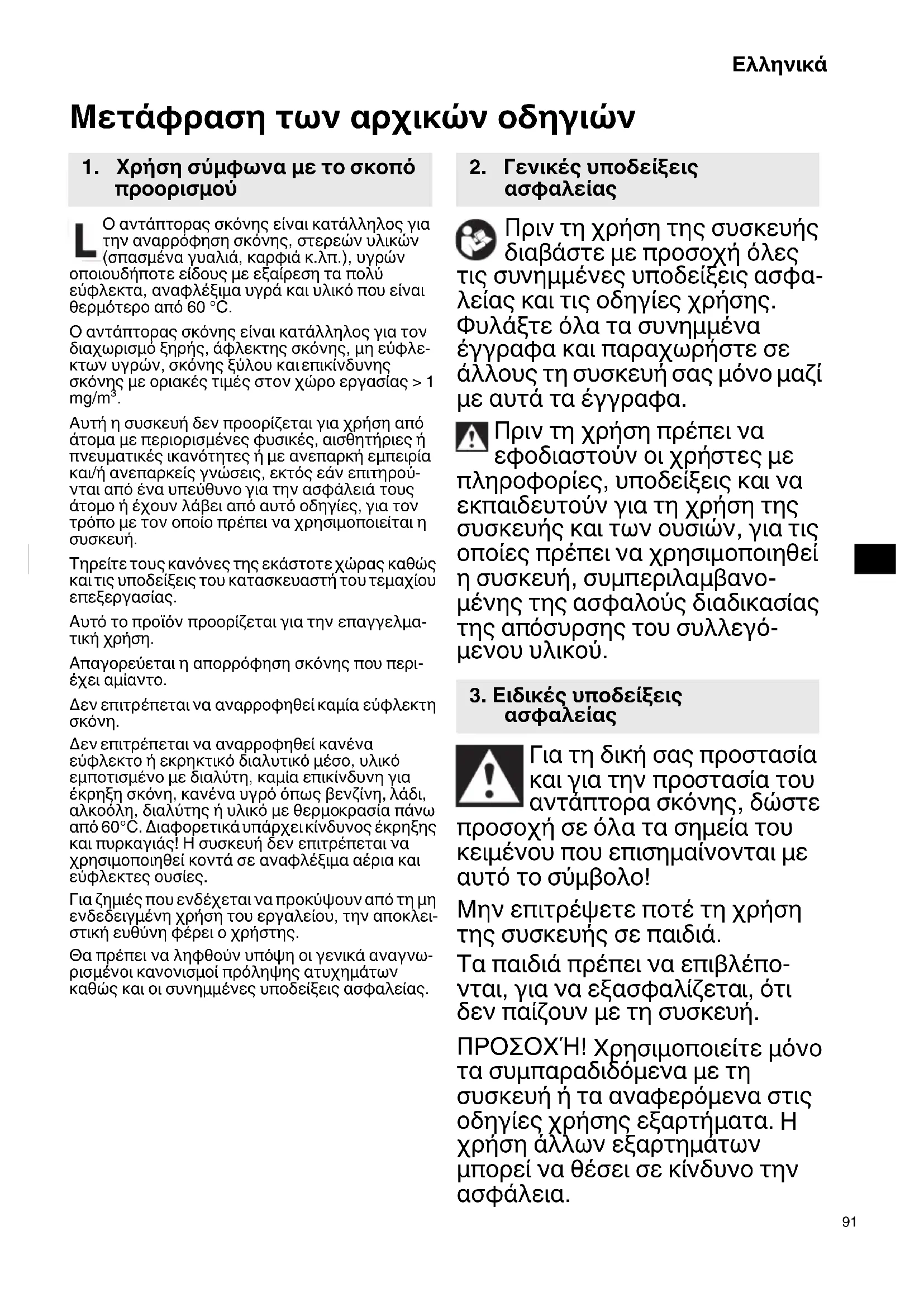 συσκευή εμπεριέχει βλαβερή για την υγεία σκόνη. Οι διαδικα- σίες εκκένωσης και συντήρησης, συμπεριλαμβανομένης της απόσυρσης των δοχείων συλλογής της σκόνης, επιτρέ- πεται να πραγματοποιούνται μόνο από ειδικευμένα άτομα, τα οποία φέρουν αντίστοιχο εξοπλισμό προστασίας. ΠΡΟΕΙΔΟΠΟΊΗΣΗ από γενικό κίνδυνο!