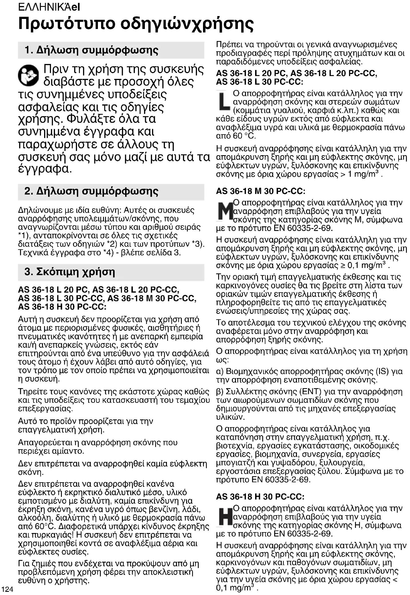 Δηλώνουμε με ιδία ευθύνη: Αυτές οι συσκευές αναρρόφησης υπολειμμάτων/σκόνης, που αναγνωρίζονται μέσω τύπου και αριθμού σειράς *1), ανταποκρίνονται σε όλες τις σχετικές διατάξεις των οδηγιών *2) και των προτύπων *3). Τεχνικά έγγραφα στο *4) - βλέπε σελίδα 3. AS 36-18 L 20 PC, AS 36-18 L 20 PC-CC, AS 36-18 L 30 PC-CC, AS 36-18 M 30 PC-CC, AS 36-18 H 30 PC-CC: Αυτή η συσκευή δεν προορίζεται για χρήση από άτομα με περιορισμένες φυσικές, αισθητήριες ή πνευματικές ικανότητες ή με ανεπαρκή εμπειρία και/ή ανεπαρκείς γνώσεις, εκτός εάν επιτηρούνται από ένα υπεύθυνο για την ασφάλειά τους άτομο ή έχουν λάβει από αυτό οδηγίες, για τον τρόπο με τον οποίο πρέπει να χρησιμοποιείται