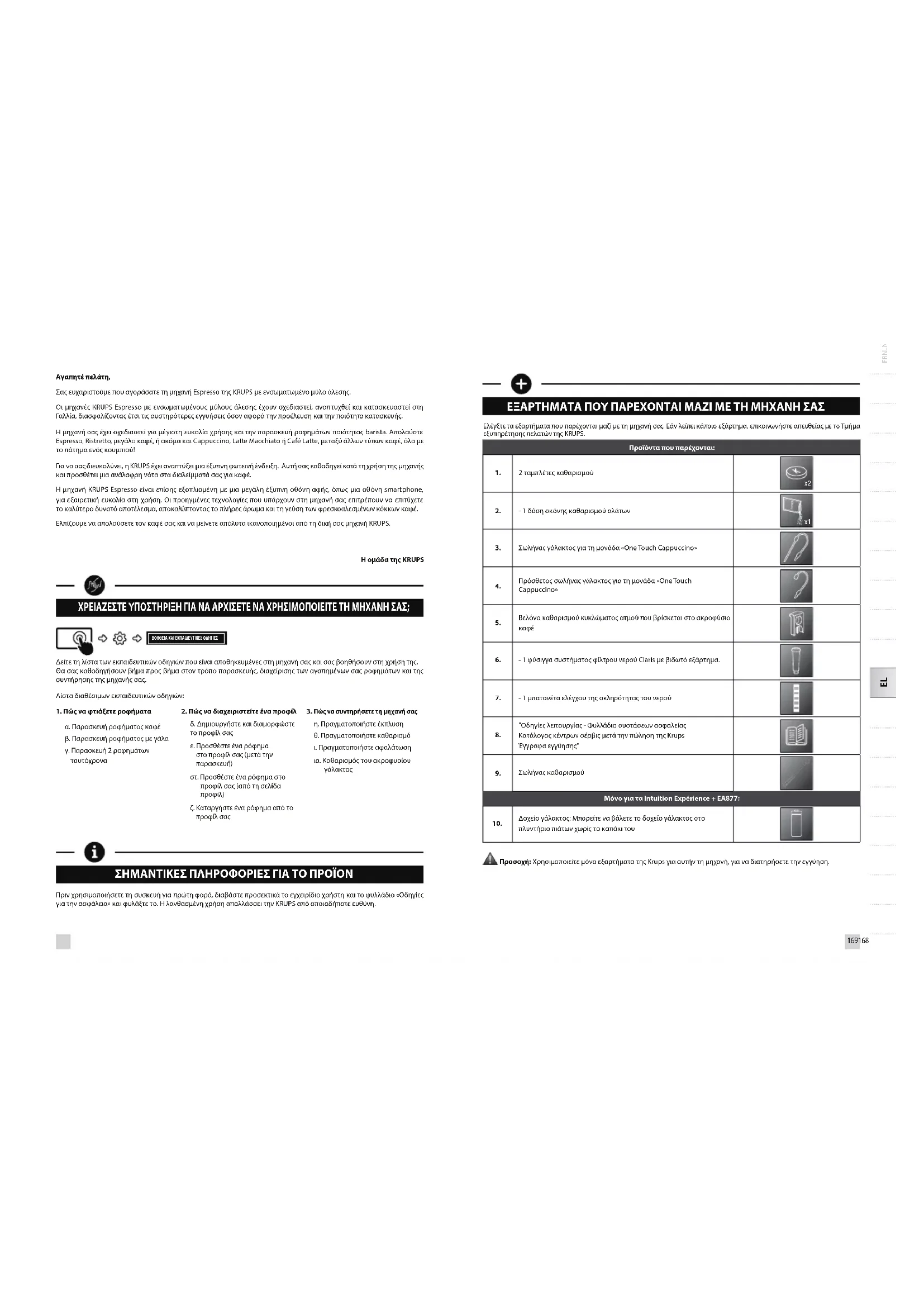 ΣΗΜΑΝΤΙΚΕΣ ΠΛΗΡΟΦΟΡΙΕΣ ΓΙΑ ΤΟ ΠΡΟΪΟΝ Πριν χρησιμοποιήσετε τη συσκευή για πρώτη φορά, διαβάστε προσεκτικά το εγχειρίδιο χρήστη και το φυλλάδιο «Οδηγίες για την ασφάλεια» και φυλάξτε το. Η λανθασμένη χρήση απαλλάσσει την KRUPS από οποιαδήποτε ευθύνη. ΒΟΗΘΕΙΑ ΚΑΙ ΕΚΠΑΙΔΕΥΤΙΚΕΣ ΟΔΗΓΙΕΣ ΕΞΑΡΤΗΜΑΤΑ ΠΟΥ ΠΑΡΕΧΟΝΤΑΙ ΜΑΖΙ ΜΕ ΤΗ ΜΗΧΑΝΗ ΣΑΣ Ελέγξτε τα εξαρτήματα που παρέχονται μαζί με τη μηχανή σας. Εάν λείπει κάποιο εξάρτημα, επικοινωνήστε απευθείας με το Τμήμα εξυπηρέτησης πελατών της KRUPS. Προϊόντα που παρέχονται: