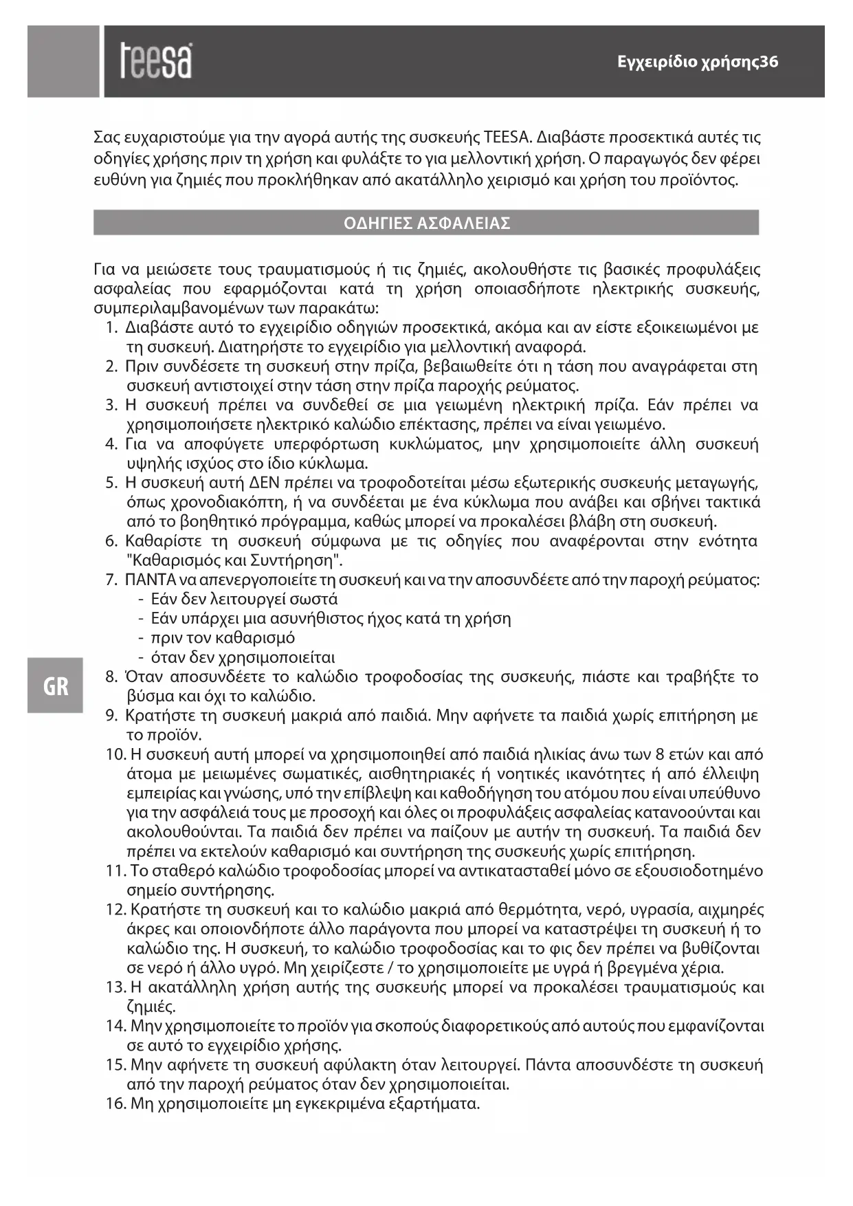 - Fournis : fer à repasser, récipient de remplissage d’eauGR Εγχειρίδιο χρήσης36 Σας ευχαριστούμε για την αγορά αυτής της συσκευής TEESA. Διαβάστε προσεκτικά αυτές τις οδηγίες χρήσης πριν τη χρήση και φυλάξτε το για μελλοντική χρήση. Ο παραγωγός δεν φέρει ευθύνη για ζημιές που προκλήθηκαν από ακατάλληλο χειρισμό και χρήση του προϊόντος. ΟΔΗΓΙΕΣ ΑΣΦΑΛΕΙΑΣ Για να μειώσετε τους τραυματισμούς ή τις ζημιές, ακολουθήστε τις βασικές προφυλάξεις ασφαλείας που εφαρμόζονται κατά τη χρήση οποιασδήποτε ηλεκτρικής συσκευής, συμπεριλαμβανομένων των παρακάτω: