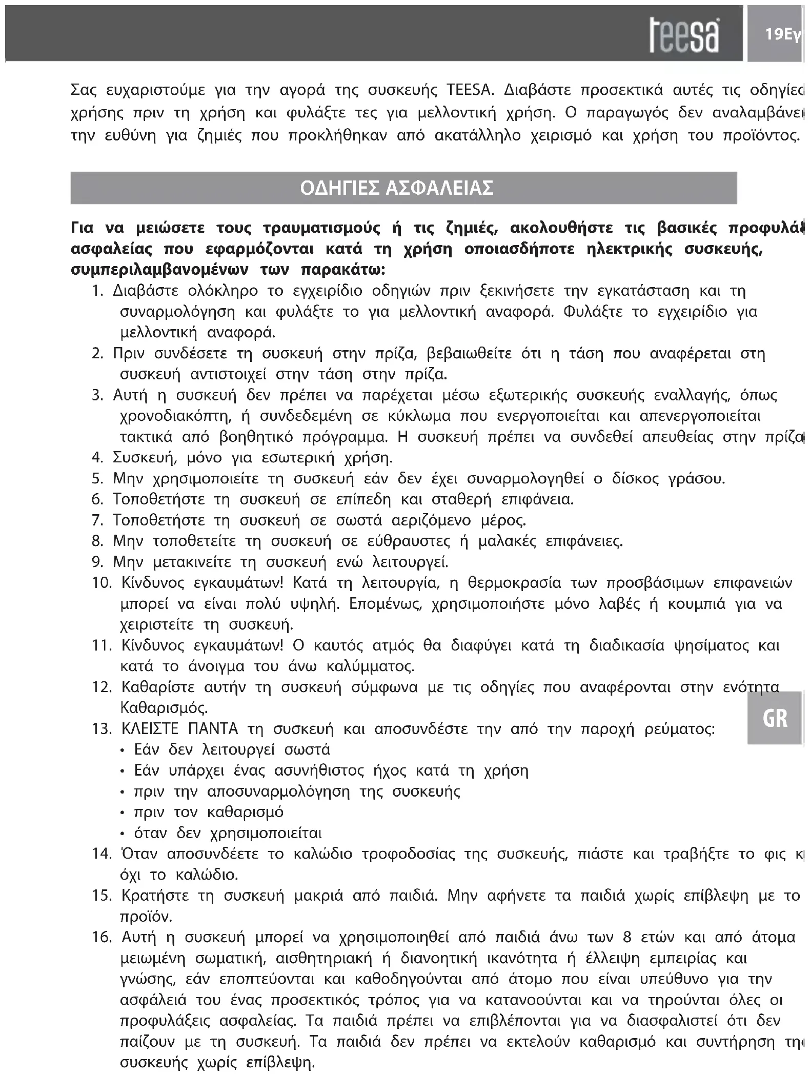 μειωμένη σωματική, αισθητηριακή ή διανοητική ικανότητα ή έλλειψη εμπειρίας και γνώσης, εάν εποπτεύονται και καθοδηγούνται από άτομο που είναι υπεύθυνο για την ασφάλειά του ένας προσεκτικός τρόπος για να κατανοούνται και να τηρούνται όλες οι προφυλάξεις ασφαλείας. Τα παιδιά πρέπει να επιβλέπονται για να διασφαλιστεί ότι δεν παίζουν με τη συσκευή. Τα παιδιά δεν πρέπει να εκτελούν καθαρισμό και συντήρηση της συσκευής χωρίς επίβλεψη. Σας ευχαριστούμε για την αγορά της συσκευής TEESA. Διαβάστε προσεκτικά αυτές τις οδηγίες χρήσης πριν τη χρήση και φυλάξτε τες για μελλοντική χρήση. Ο παραγωγός δεν αναλαμβάνει την ευθύνη για ζημιές που προκλήθηκαν από ακατάλληλο χειρισμό και χρήση του προϊόντος. 19Εγχειρίδιο χρήσης GR17. Το σταθερό καλώδιο τροφοδοσίας μπορεί να αντικατασταθεί μόνο σε εξουσιοδοτημένο σημείο σέρβις.