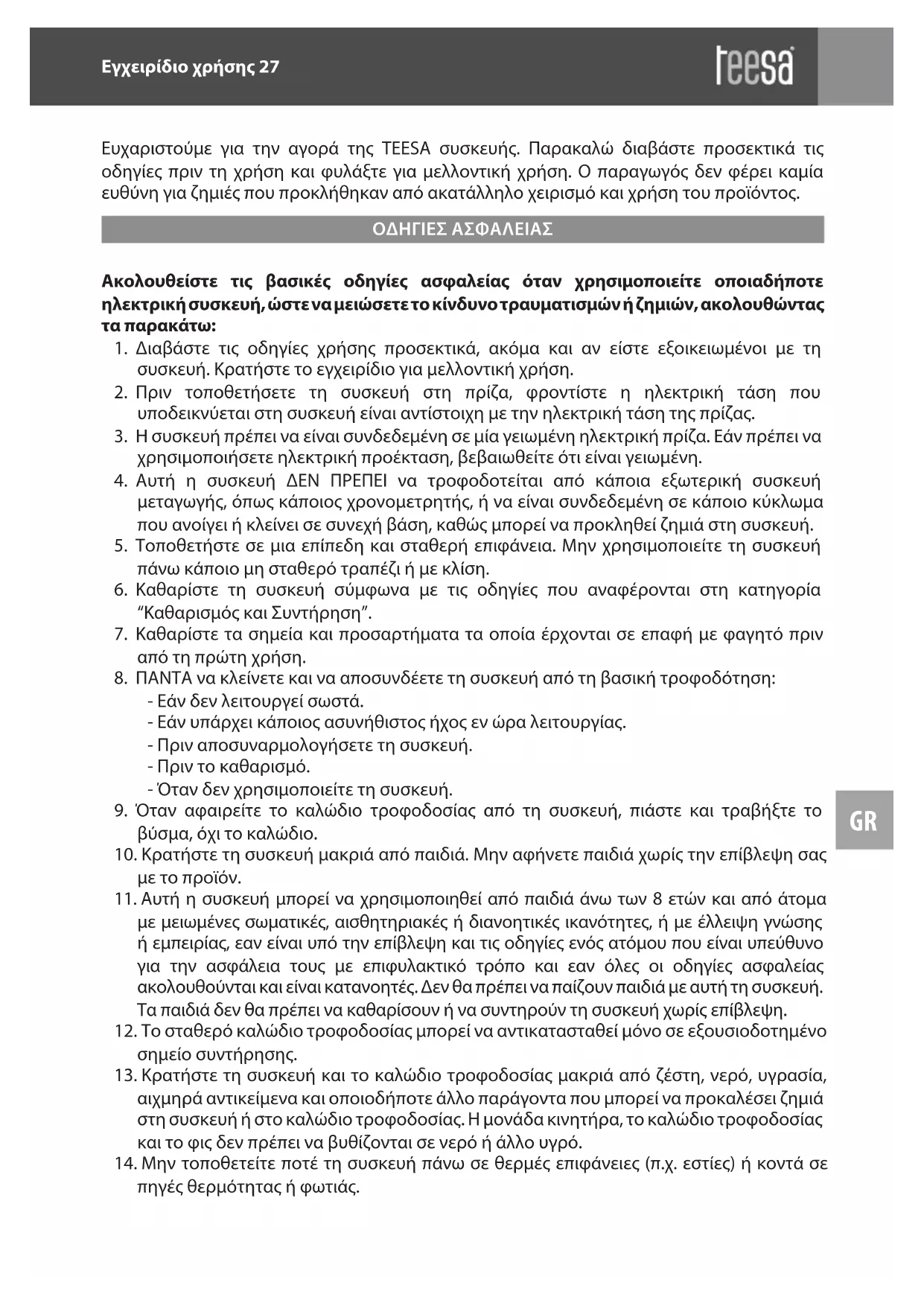 Ευχαριστούμε για την αγορά της TEESA συσκευής. Παρακαλώ διαβάστε προσεκτικά τις οδηγίες πριν τη χρήση και φυλάξτε για μελλοντική χρήση. Ο παραγωγός δεν φέρει καμία ευθύνη για ζημιές που προκλήθηκαν από ακατάλληλο χειρισμό και χρήση του προϊόντος. ΟΔΗΓΙΕΣ ΑΣΦΑΛΕΙΑΣ Ακολουθείστε τις βασικές οδηγίες ασφαλείας όταν χρησιμοποιείτε οποιαδήποτε ηλεκτρική συσκευή, ώστε να μειώσετε το κίνδυνο τραυματισμών ή ζημιών, ακολουθώντας τα παρακάτω:
