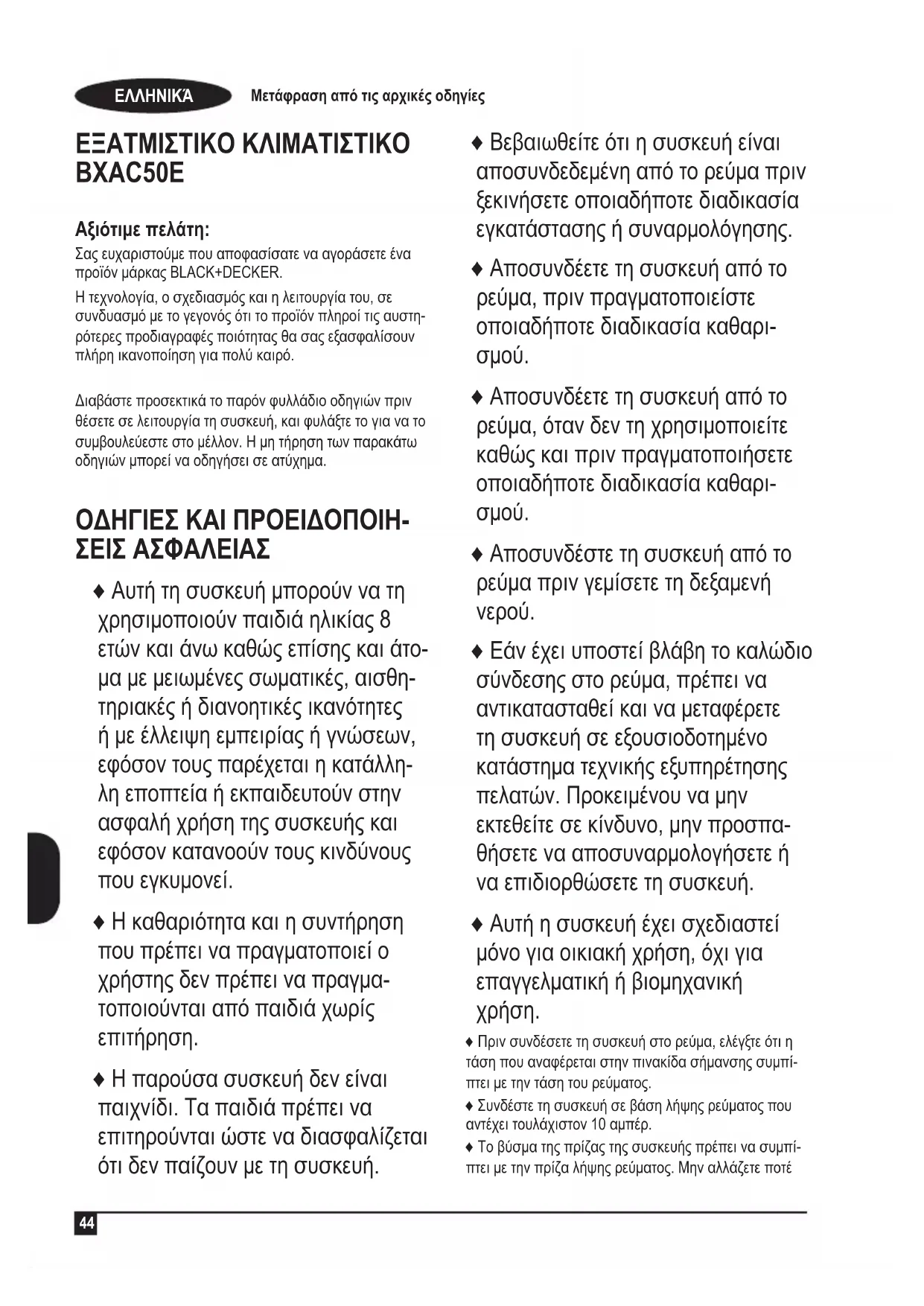 ΕΞΑΤΜΙΣΤΙΚΌ ΚΛΙΜΑΤΙΣΤΙΚΌ BXAC50E Αξιότιμε πελάτη: Σας ευχαριστούμε που αποφασίσατε να αγοράσετε ένα προϊόν μάρκας BLACK+DECKER. Η τεχνολογία, ο σχεδιασμός και η λειτουργία του, σε συνδυασμό με το γεγονός ότι το προϊόν πληροί τις αυστη- ρότερες προδιαγραφές ποιότητας θα σας εξασφαλίσουν πλήρη ικανοποίηση για πολύ καιρό. Διαβάστε προσεκτικά το παρόν φυλλάδιο οδηγιών πριν θέσετε σε λειτουργία τη συσκευή, και φυλάξτε το για να το συμβουλεύεστε στο μέλλον. Η μη τήρηση των παρακάτω οδηγιών μπορεί να οδηγήσει σε ατύχημα. ΌΔΗΓΙΕΣ ΚΑΙ ΠΡΌΕΙΔΌΠΌΙΗ- ΣΕΙΣ ΑΣΦΑΛΕΙΑΣ ♦ Αυτή τη συσκευή μπορούν να τη χρησιμοποιούν παιδιά ηλικίας 8 ετών και άνω καθώς επίσης και άτο- μα με μειωμένες σωματικές, αισθη- τηριακές ή διανοητικές ικανότητες ή με έλλειψη εμπειρίας ή γνώσεων, εφόσον τους παρέχεται η κατάλλη- λη εποπτεία ή εκπαιδευτούν στην ασφαλή χρήση της συσκευής και εφόσον κατανοούν τους κινδύνους που εγκυμονεί. ♦ Η καθαριότητα και η συντήρηση που πρέπει να πραγματοποιεί ο χρήστης δεν πρέπει να πραγμα- τοποιούνται από παιδιά χωρίς